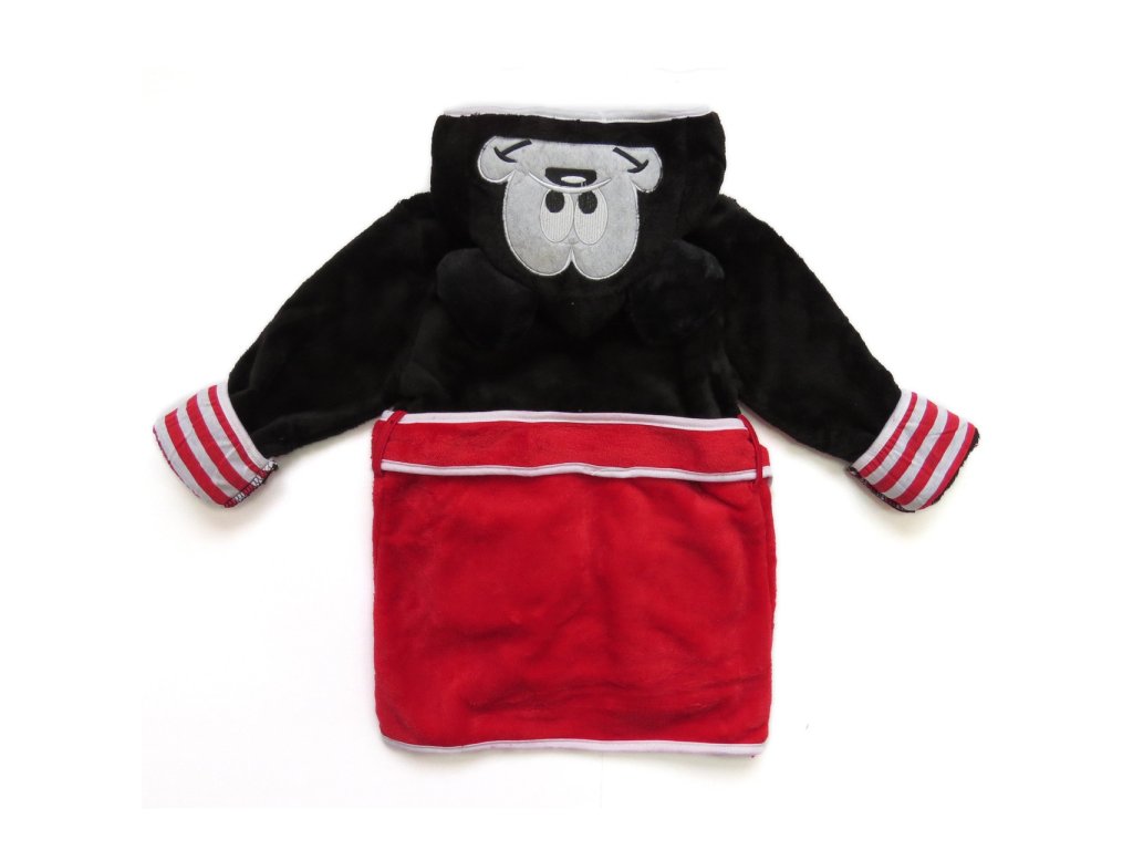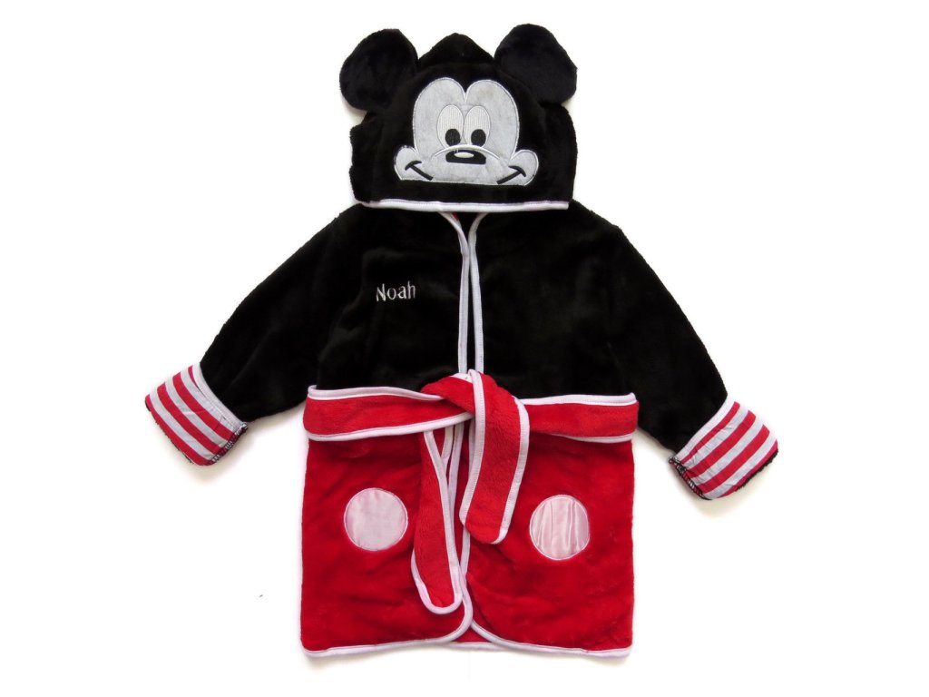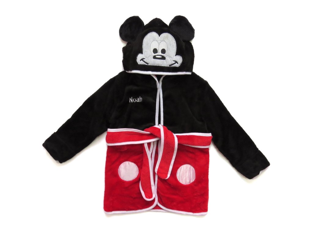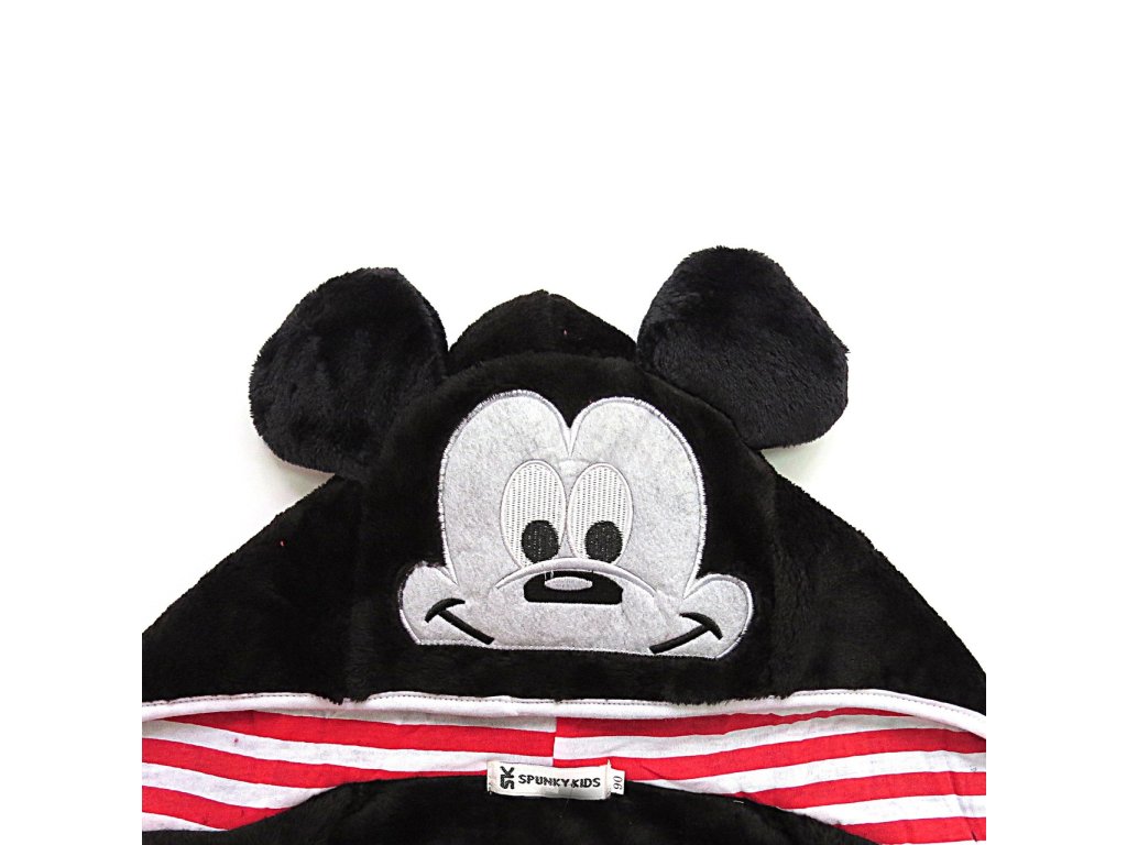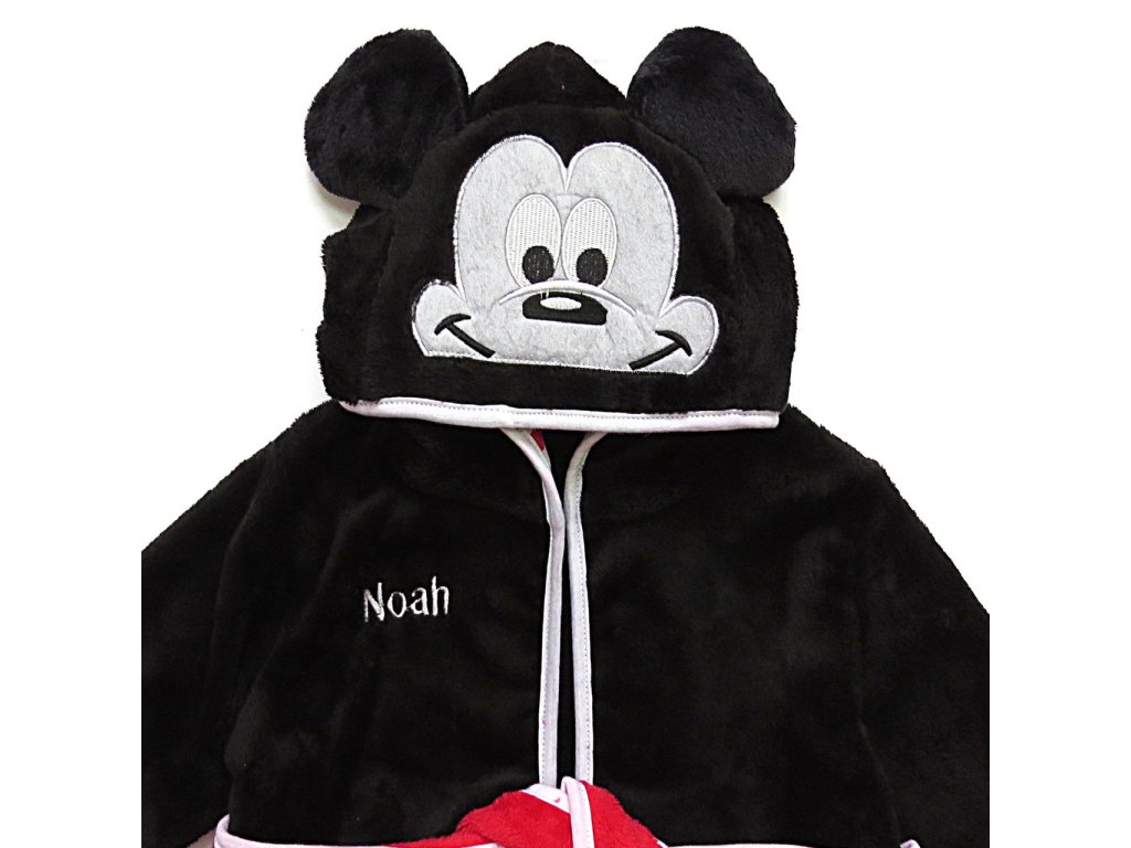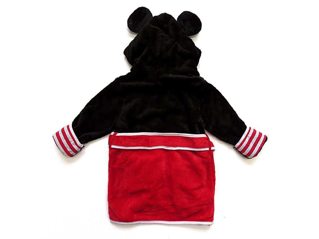 Na prvý pohľad upúta kapucňa, ktorá je navrhnutá v štýle Mickeyho hlavy, vrátane jeho výrazných uší a tváre. Vnútorná časť kapucne je ozdobená pruhovaným vzorom. Celkový dizajn je starostlivo premyslený, aby nielen vyzeral atraktívne, ale aj bol funkčný a pohodlný pre každodenné použitie. Župan má klasický strih s opaskom, ktorý umožňuje ľahké obliekanie a pohodlné nosenie. Farebné prevedenie je v kombinácii farieb čiernej, červenej a bielej pripomína Mickeyho tradičný kostým, najmä jeho typické červené nohavice s bielymi gombíkmi. Mäkký a hebký materiál je hladký na dotyk a je šetrný k detskej pokožke.