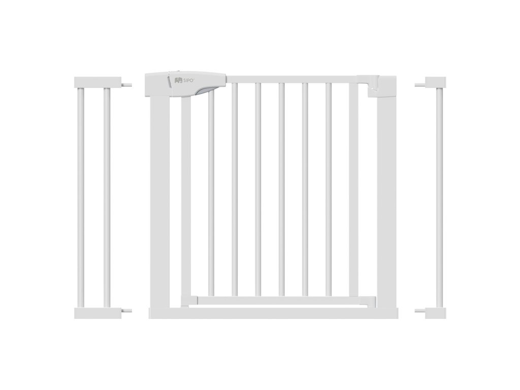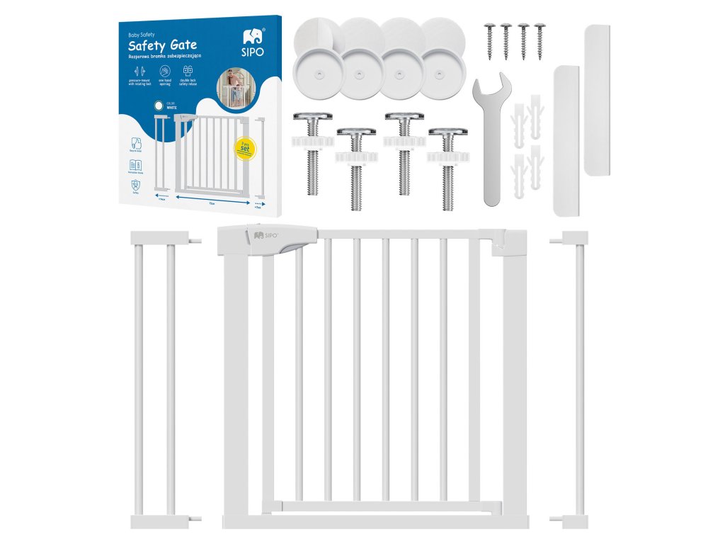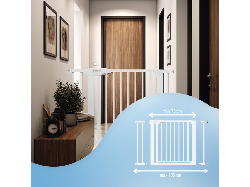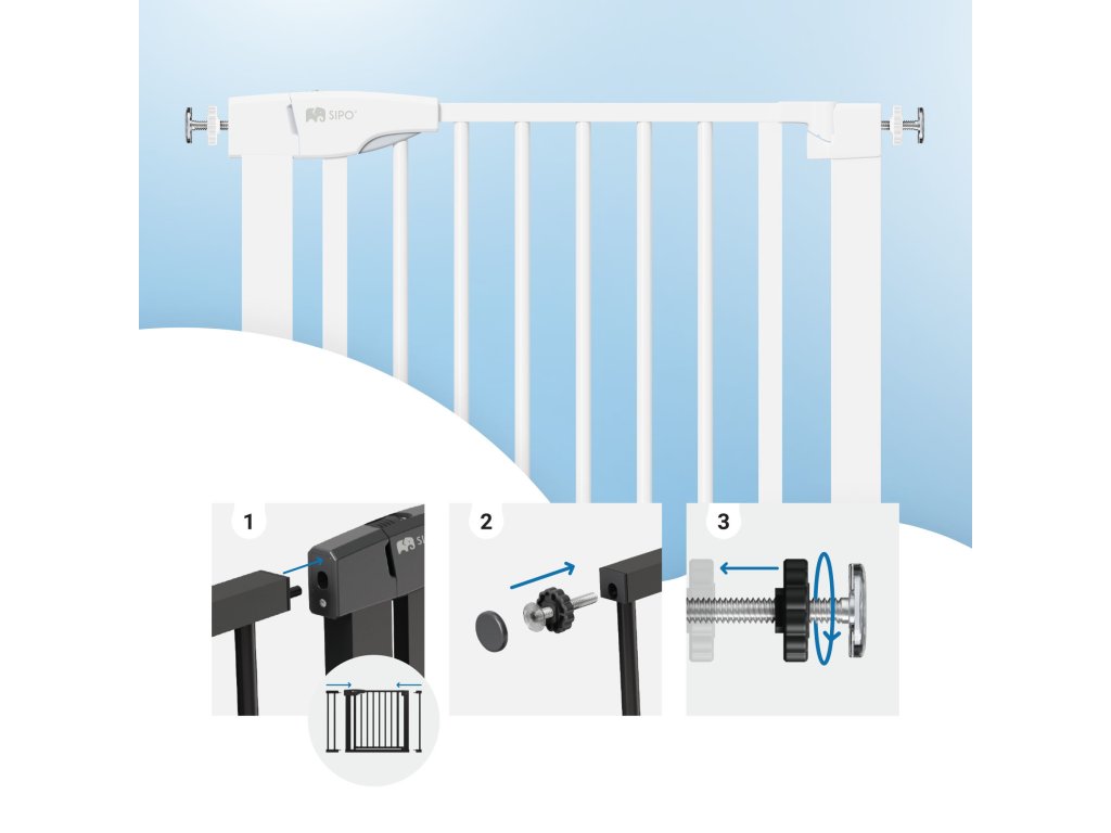 Sada pozostávajúca z brány a kovového nadstavca so šírkou 7 alebo 14 cm je vhodná pre schody alebo dvere široké 75-104 cm. Vďaka nastavovacím skrutkám ju môžete rýchlo a stabilne upevniť na mieste.
