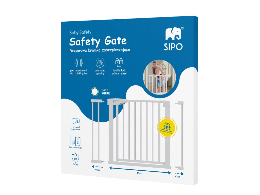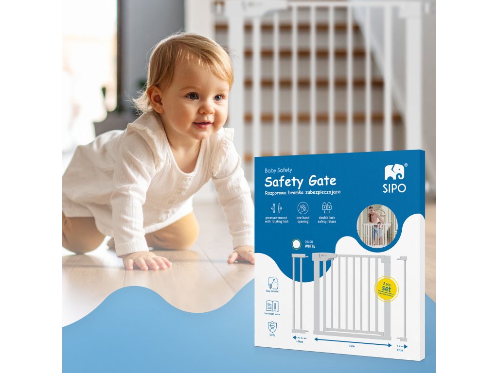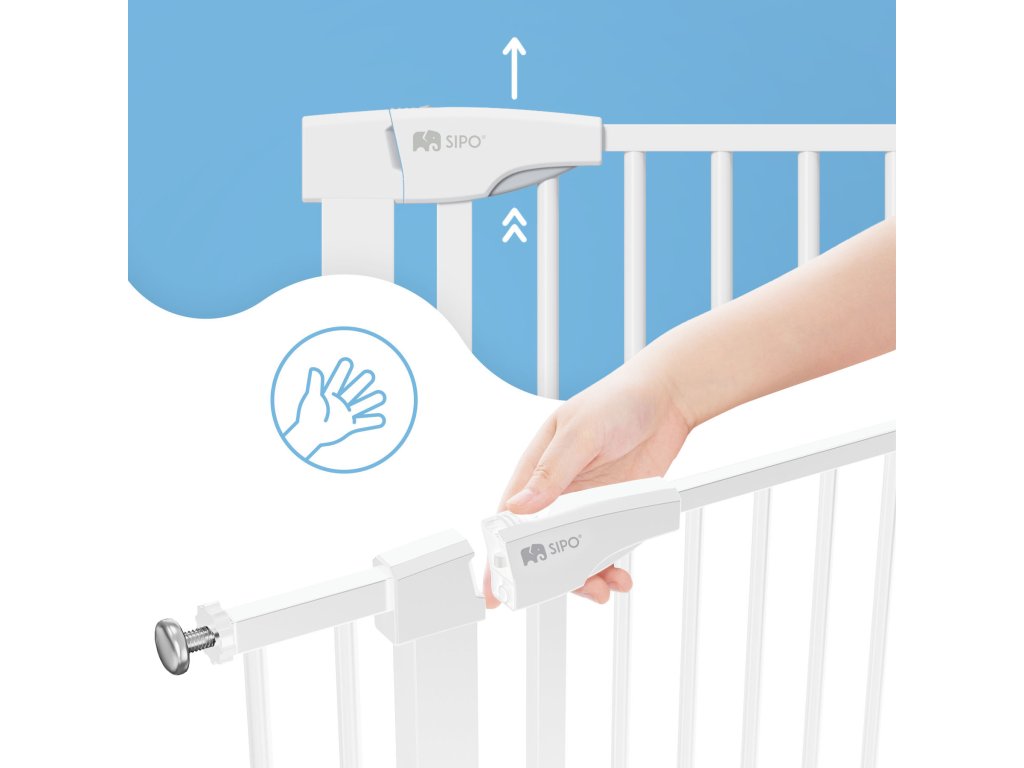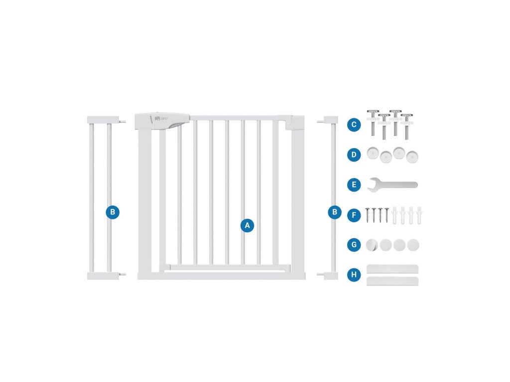 Sada pozostávajúca z brány a kovového nadstavca so šírkou 7 alebo 14 cm je vhodná pre schody alebo dvere široké 75-104 cm. Vďaka nastavovacím skrutkám ju môžete rýchlo a stabilne upevniť na mieste.