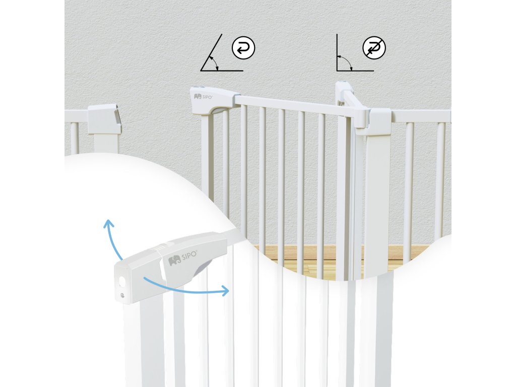 Zábranu možno ľahko otvoriť jednou rukou na oboch stranách a po zatvorení sa bezpečne zaistí na mieste. Zábrana ponúka uhol otvorenia 180° / ak zábranu otvoríte pod 90°, sama sa zatvorí, ak ju otvoríte úplne - zostane otvorená.