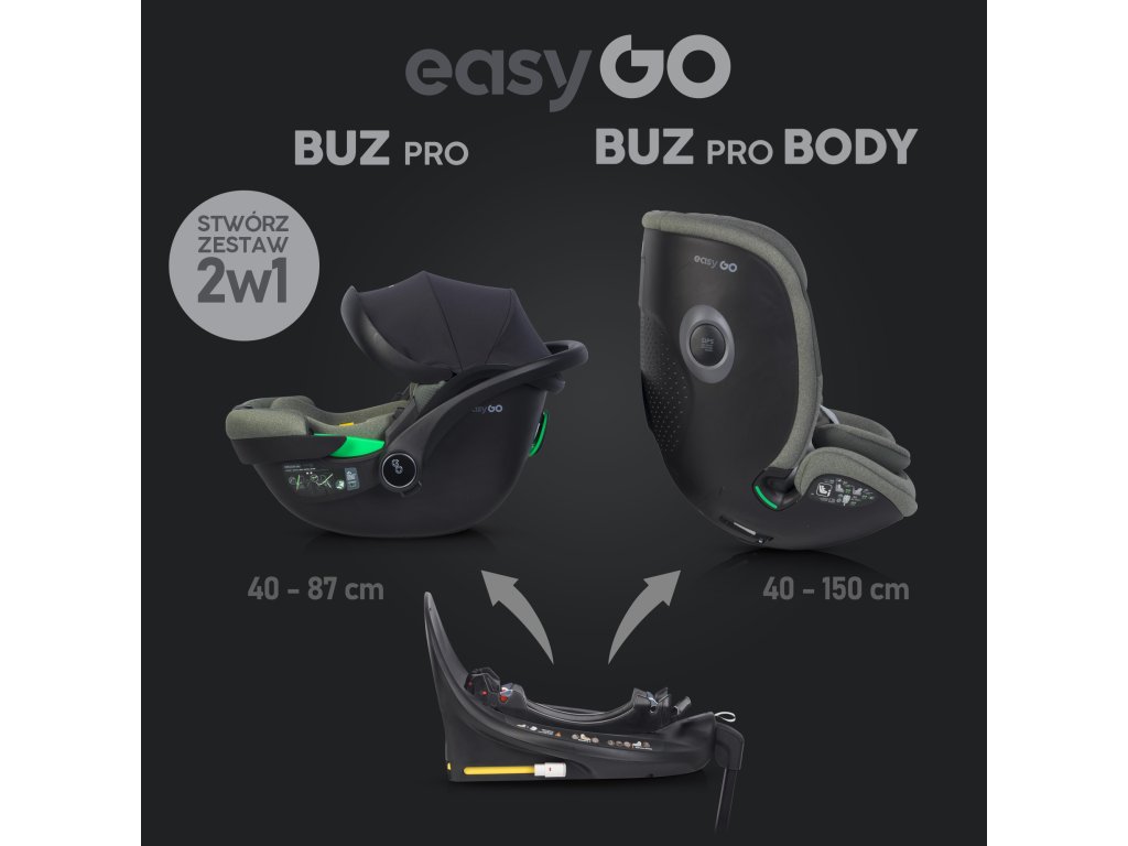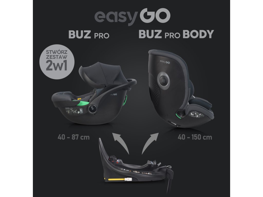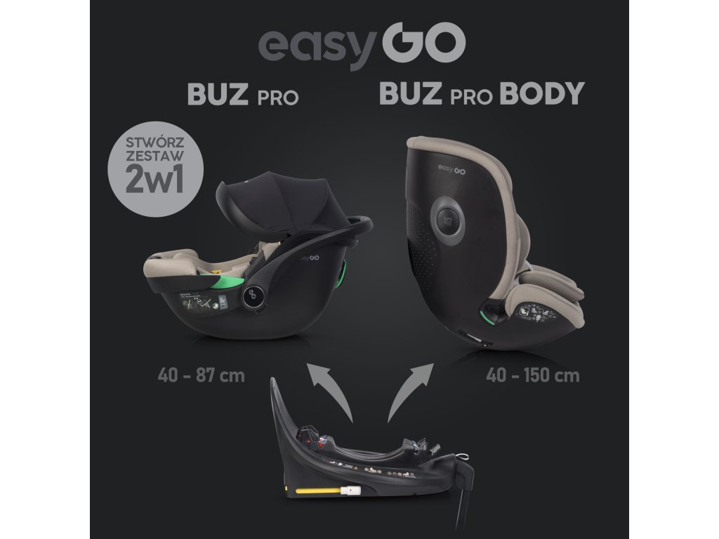 Možnosť vytvorenia 2 v 1 setu: Kombinujte základňu s autosedačkami EasyGo BUZ, BUZ PRO alebo RELAX pre deti od 40 do 87 cm a s autosedačkou BUZ PRO BODY pre deti až do 150 cm. Tento set je cenovo výhodný, pretože využíva jednu základňu pre viac autosedačiek.