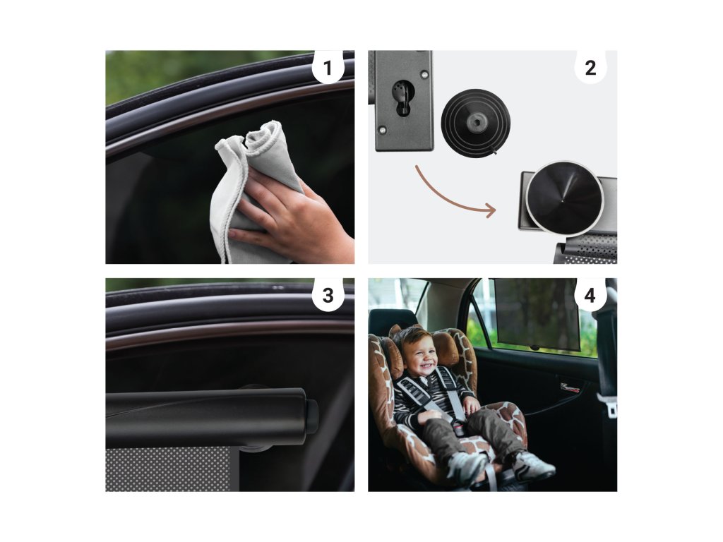 Pred inštaláciou očistite okno od prachu a nečistôt. Umiestnite slnečnú clonu na vnútornú stranu okna a upevnite ju pomocou prísaviek. Po dokončení stlačte bočné tlačidlo na kryte slnečnej clony – materiál sa automaticky zasunie, čo umožňuje rýchle a pohodlné zloženie. Slnečnú clonu je potom možné ľahko odstrániť, zložiť a uložiť na suchom mieste. Výrobok je opakovane použiteľný, ak je správne nainštalovaný a odstránený.