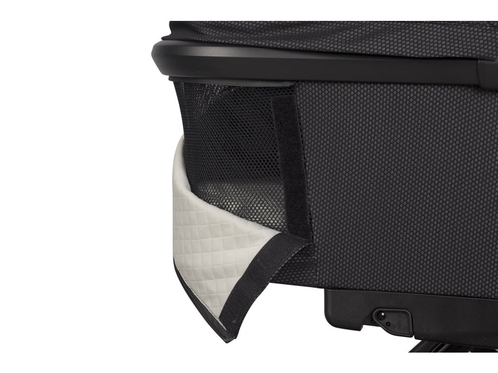 - Praktické detaily: Kočík má veľký nákupný košík s reflexnými prvkami pre lepšiu viditeľnosť a bezpečnosť. Obsahuje tiež možnosť dokúpenia tašky s upevňovacím systémom a ramenným popruhom, ktorá slúži aj ako prebaľovacia podložka.