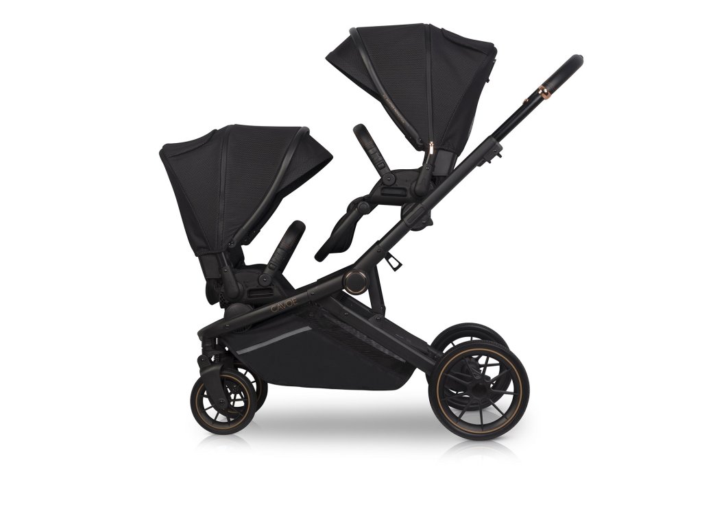 - Tandemové usporiadanie: Kočík je navrhnutý ako tandem, čo znamená, že obe deti sedia za sebou. Obsahuje dve plnohodnotné sedadlá s možnosťou dokúpenia jednej alebo dvoch gondol.