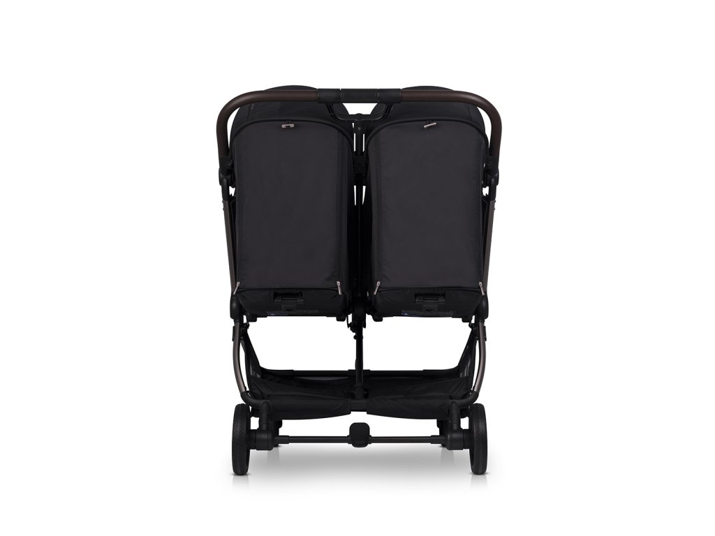 DEUX je vybavený jedinečným automatickým skladacím systémom, ktorý ovládate iba jednou rukou. Stačí aktivovať mechanizmus a zatlačiť rukoväť dopredu – kočík sa automaticky zloží ako kyvadlo do prekvapivo kompaktných rozmerov. Po zložení stojí kočík vo zvislej poloze a zábrana slúži ako pohodlná rukoväť na prenášanie. Tento systém je obrovským uľahčením najmä v situáciách, keď nakládáte kočík do batožinového priestoru a súčasne musíte dohliadať na dve deti. Skladanie kočíka pre dvojčatá nikdy nebolo jednoduchšie.