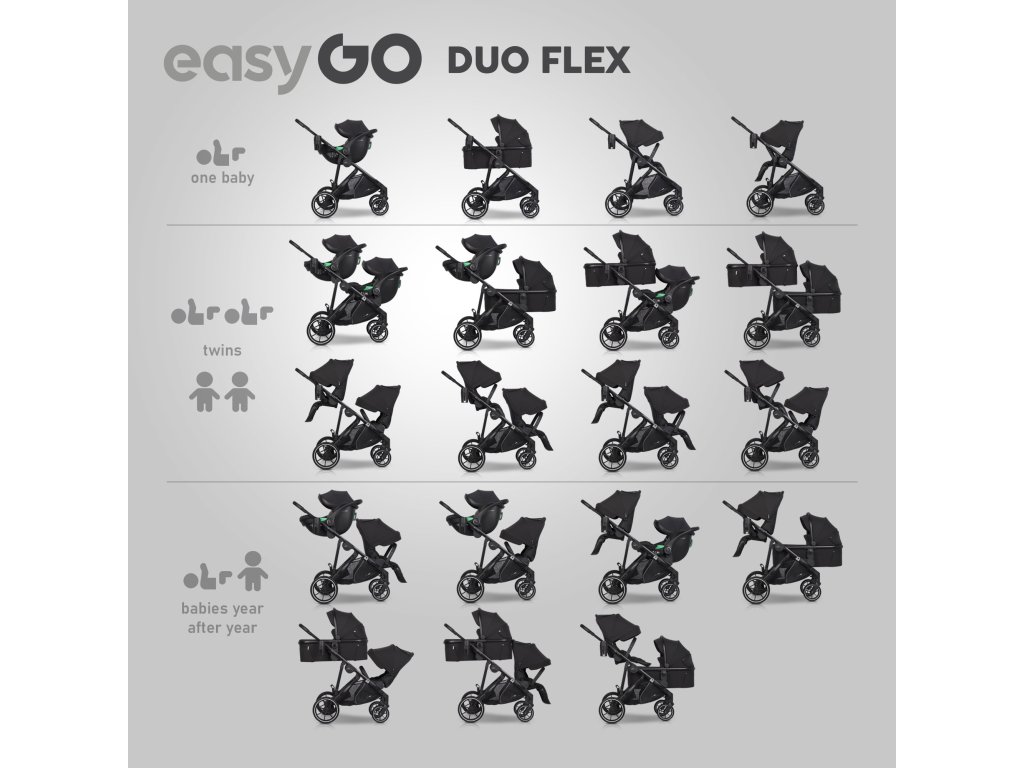 S kočíkom EasyGo Duoflex získavate nie len kvalitný produkt, ale aj kľud a istotu, že váš kočík porastie spolu s vашou rodinou. Nemusíte investovať do viacerých kočíkov – Duoflex sa prispôsobí všetkým zmenám a potrebám. Je to inteligentné, ekonomické a praktické riešenie, ktoré vám poslúži mnoho rokov.