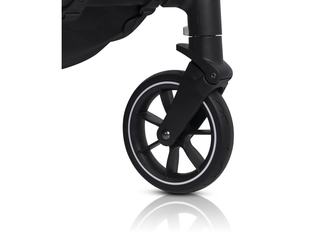 Podvozok kočíka Duoflex je navrhnutý s dôrazom na maximálny komfort a manévrovateľnosť. Veľké gumové bezduškové kolesá zabezpečujú plynulú jazdu na akýchkoľvek povrchoch – od hladkých chodníkov až po nerovné lesné cestičky. Predné kolesá s priemerom 19,5 cm sú otočné, čo výrazne uľahčuje manévrovanie v úzkych priestoroch, obchodoch či na preplnených chodníkoch. Keď potrebujete stabilitu pri jazde po rovine alebo na nerovnom teréne, jednoducho kolesá zablokujete do priamej jazdy.