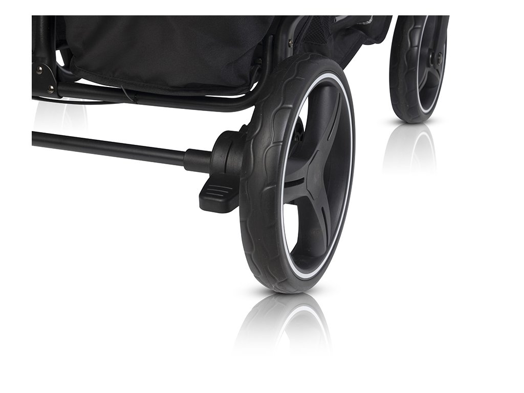 - Jednoduchá manipulácia: Vďaka otočným predným kolesám s možnosťou blokácie a celkovej amortizácii všetkých kolies je kočík veľmi ľahko ovládateľný a pohodlný na jazdu.
