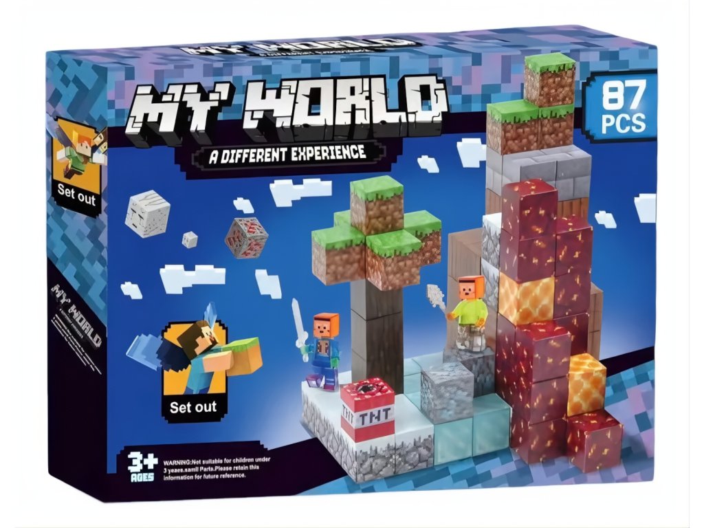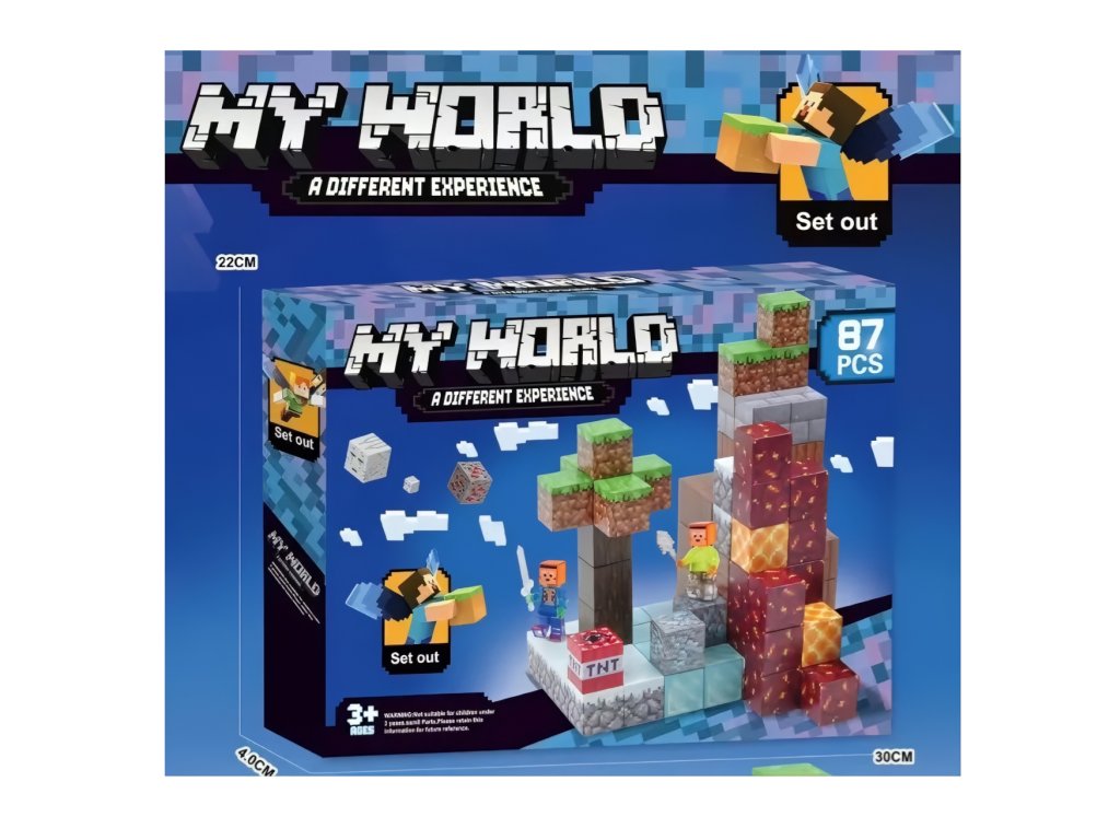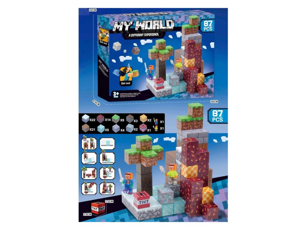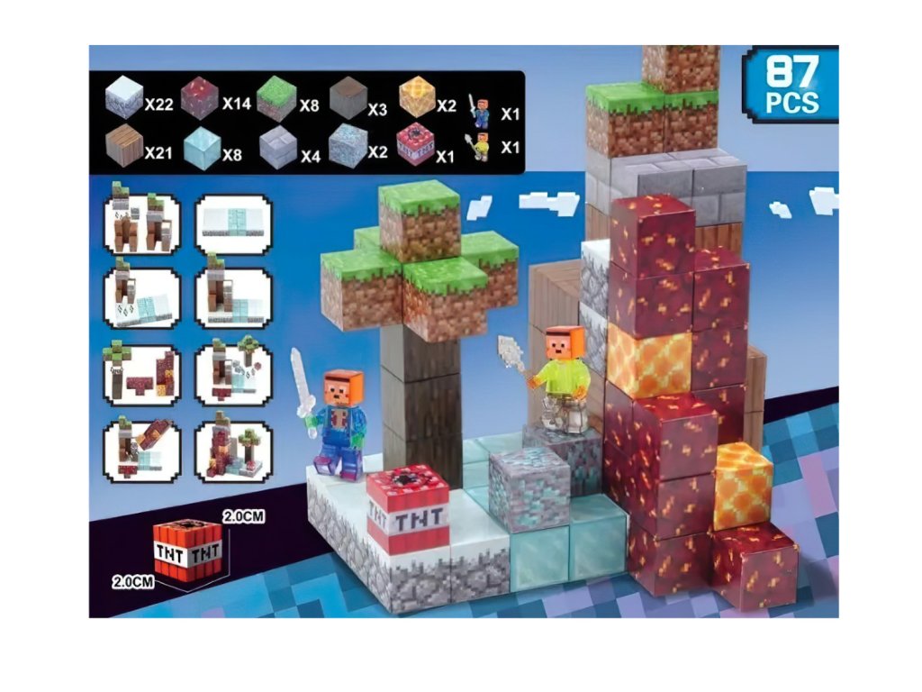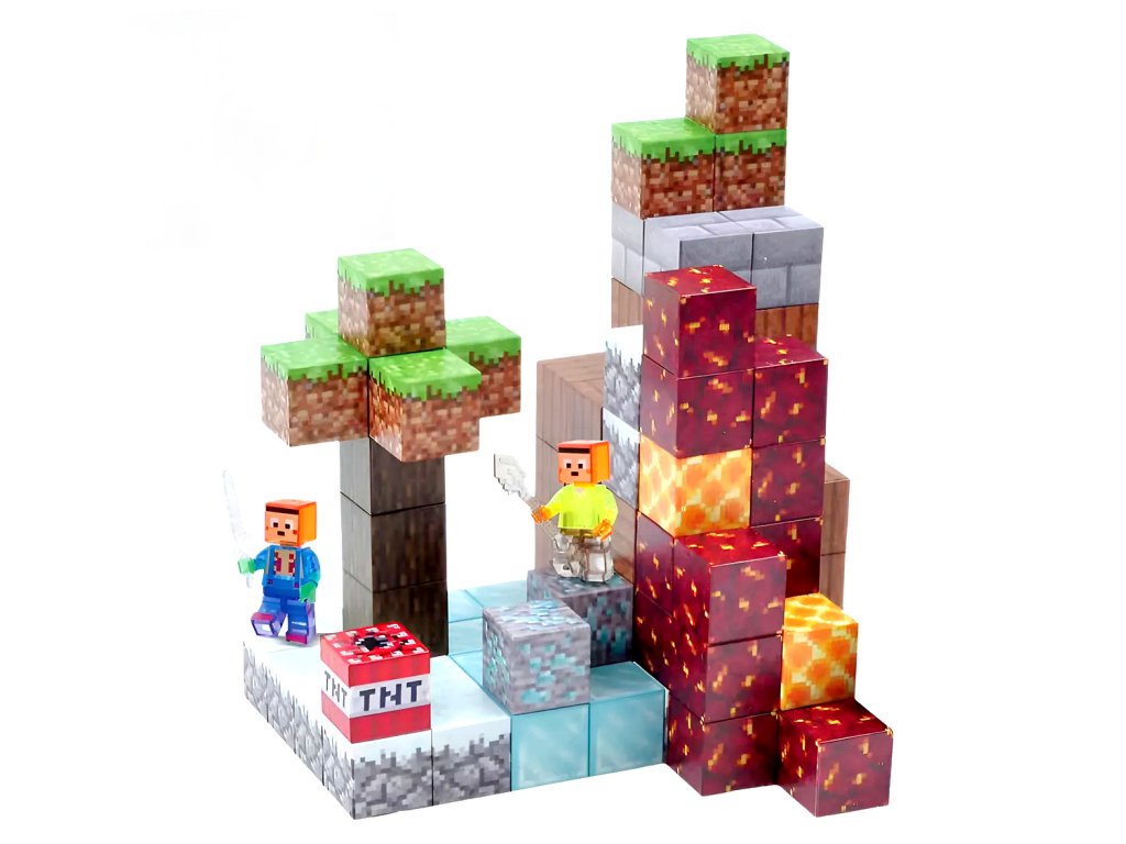 Stavebnica obsahuje 85 pevných dielikov s magnetickým spojením, vďaka ktorému je možné jednoducho stavať aj prestavovať. Každý blok je detailne potlačený tak, aby čo najvernejšie pripomínal textúry z Minecraftu – od kociek lávy a zeme po kmene stromov a diamantové kryštály. Figúrky sú vybavené mečmi a čakajú na tvoje príkazy.