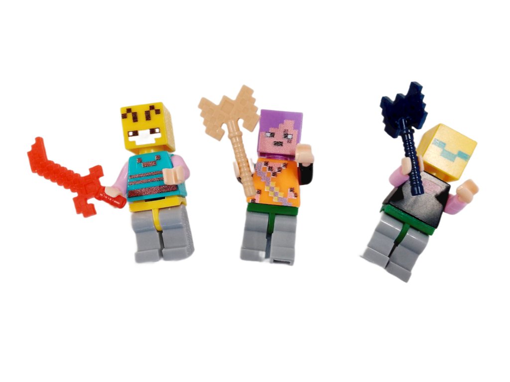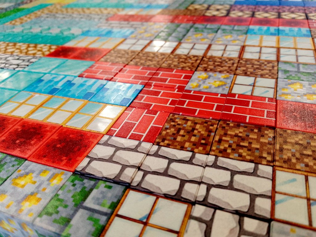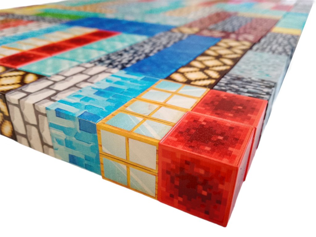 Kocky majú detailnú potlač s motívmi typických herných blokov, ako je kameň, tráva, voda, láva či vzácne suroviny. Súčasťou balenia sú aj figúrky postáv s doplnkami, ktoré umožňujú vytvárať vlastné dobrodružné scenáre vo svete Minecraft.
