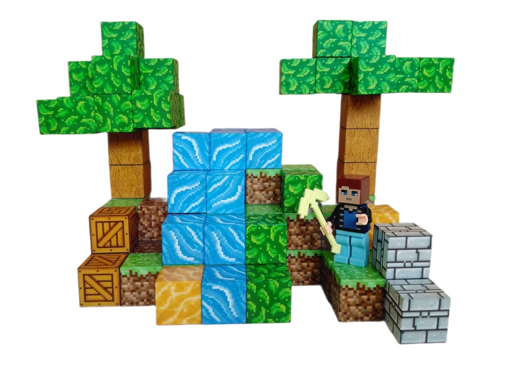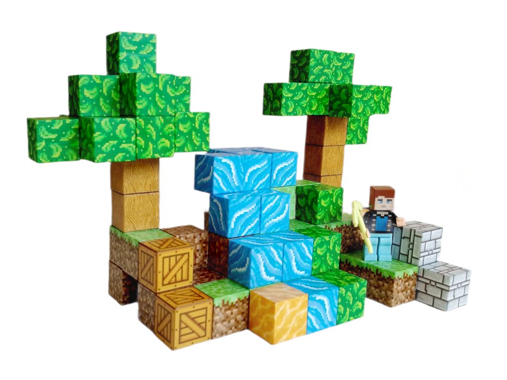 Súčasťou je aj figúrka s krompáčom, ktorá dodáva hre dobrodružný prvok a podporuje detskú fantáziu pri vytváraní vlastných príbehov. Stavebnica obsahuje magnetické kocky s realistickými potlačami rôznych herných textúr – tráva, voda, kameň, drevo alebo debny. Vďaka silným vnútorným magnetom sa jednotlivé diely ľahko spájajú, držia tvar a umožňujú stabilné stavby.