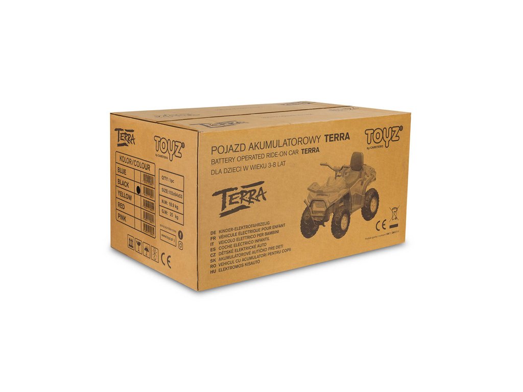 Terra od Toyz je vozidlo na batériový pohon pripravené na terénne dobrodružstvá. Štvorkolku poháňajú štyri motory s výkonom 45 W a má možnosť meniť režim jazdy medzi 4x2 a 4x4 . Priestranné sedadlo a predné a zadné tlmiče umožňujú pohodlnú jazdu. Veľké kolesá vyrobené z vysoko kvalitnej peny EVA , pomalý štart, automatická brzda a sedadlo s operadlom potiahnutým eko kožou zaručujú bezpečnú jazdu. Predné a zadné LED svetlá udržiavajú vaše vozidlo viditeľné a robia jazdu za súmraku zábavnejšou. Terra má navyše multimediálny panel s Bluetooth, ktorý spríjemní čas strávený na štvorkolke. Vozidlo je možné ovládať na diaľku pomocou diaľkového ovládača.