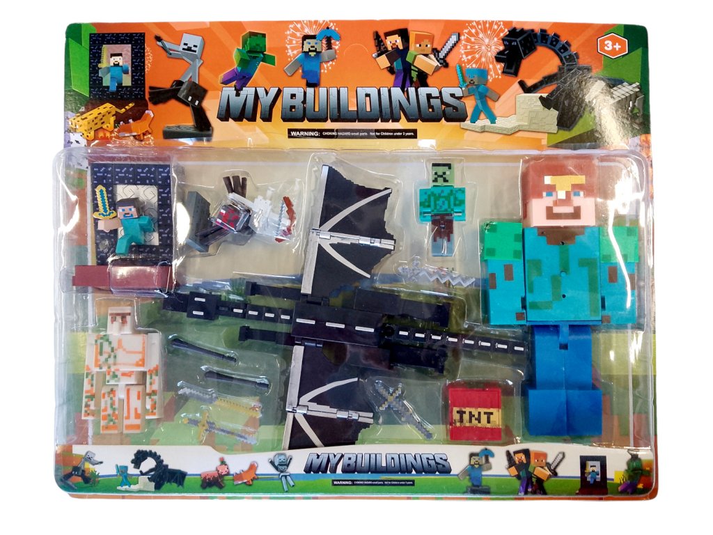 Sada obsahuje 10 rôznych postáv a doplnkov, medzi ktorými nájdete Ender Dragona, Stevea, železného golema a ďalšie ikonické postavy. Každá figúrka je detailne spracovaná v štýle kockovanej grafiky, ktorá je pre Minecraft typická.