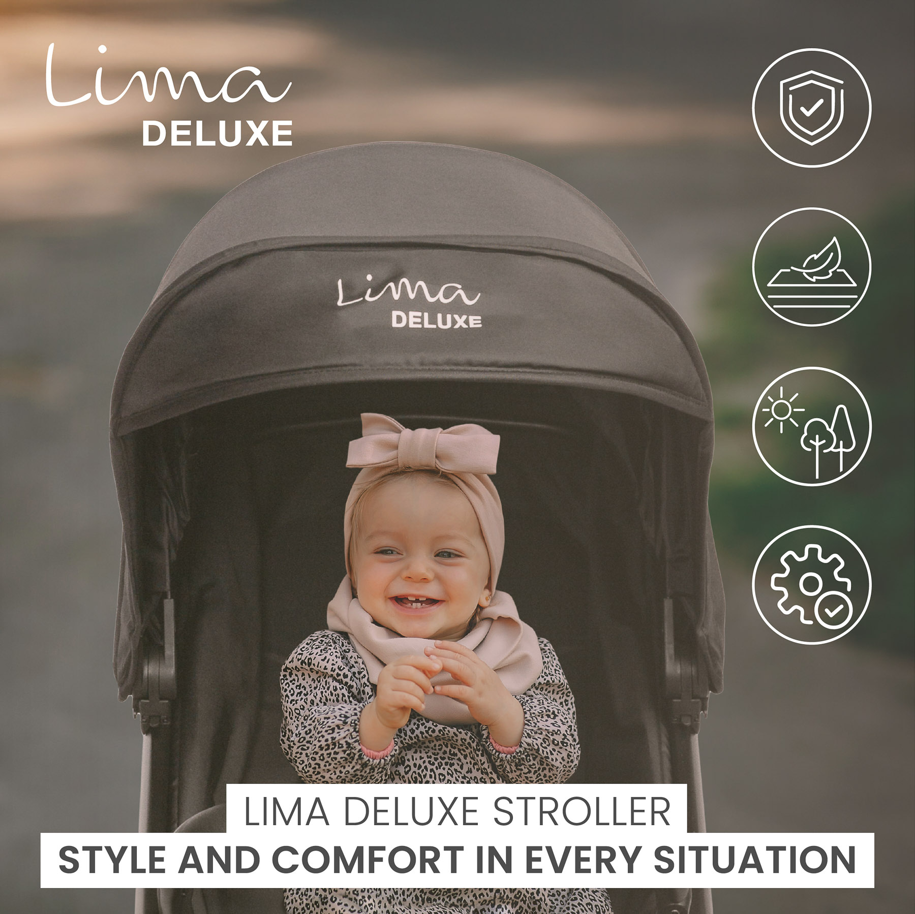 Kočík Lima Deluxe bol vytvorený s ohľadom na rodičov, ktorí radi trávia svoj čas aktívne. Pohodlie tradičného kočíka v kombinácii s vysokou funkčnosťou trojkolesového dizajnu vytvára ideálne riešenie pre rodičov, ktorí sú neustále v pohybe. Veľké, nafukovacie kolesá (zadné s priemerom 40 cm, predné s priemerom 29 cm) sa osvedčia pri jazde v náročnom teréne. Kočík je vybavený 2 brzdami: ručnou brzdou - páčkou na rukoväti kočíka; nožnou brzdou - medzi zadnými kolesami. Skladacia strieška s vetracím otvorom poskytuje ochranu pred slnkom a vetrom a priložená pláštenka a návlek na nohy zvýšia pohodlie pri prechádzkach v náročných poveternostných podmienkach. 5-bodové pásy s prednou tyčou chránia dieťa pred vypadnutím z kočíka. Lima Deluxe je tiež vybavená upevneným košíkom, ktorý pojme všetky potrebné každodenné doplnky. Uhol operadla sa dá plynulo nastaviť podľa potrieb dieťaťa a ľahko použiteľný skladací mechanizmus umožňuje pohodlnú prepravu kočíka.