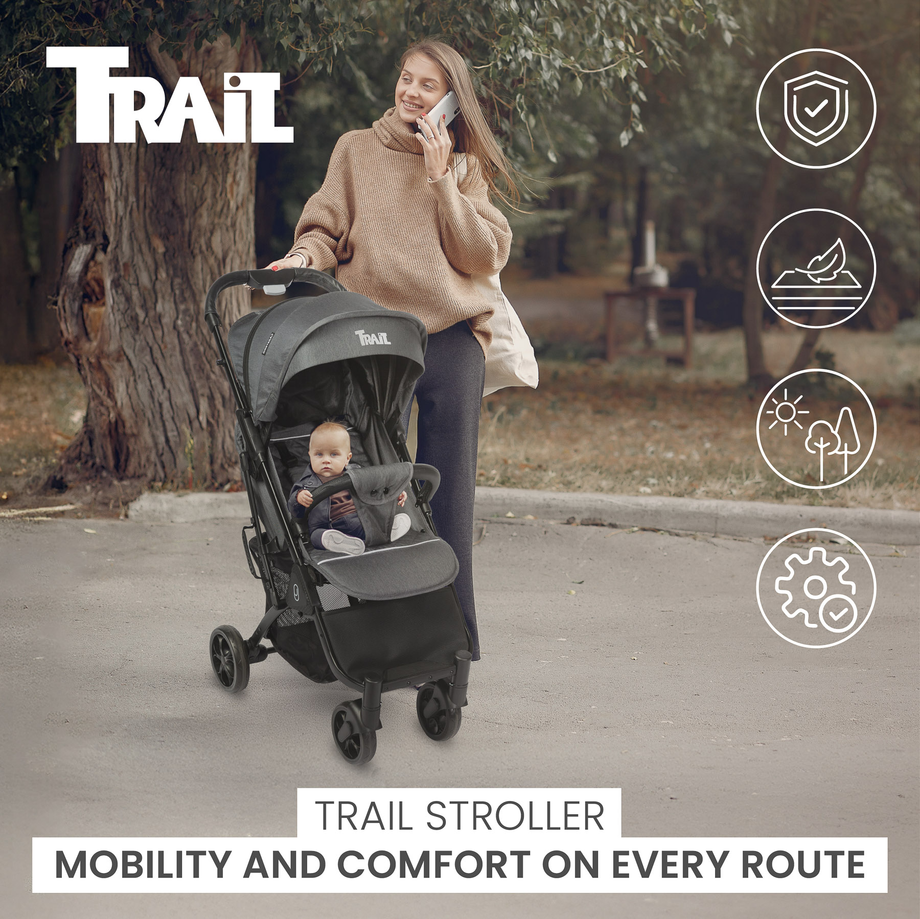 Trail je moderný kočík vytvorený pre aktívne rodiny, ktoré si cenia pohodlie cestovania. Ľahký, kompaktný a ľahko prenosný – perfektné vlastnosti do ruchu mesta aj na dlhšie cesty.