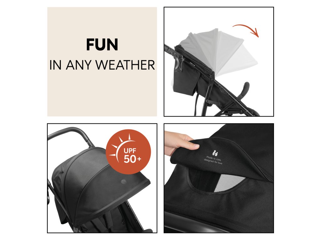Pohodlné výlety za každého počasia // Slnko alebo dážď? Veľká 4-dielna strieška chráni vaše dieťatko pred vetrom a slnkom (UV ochrana 50+). Navyše môžete mať na svoje dieťatko neustále dohľad vďaka okienku na nazeranie.