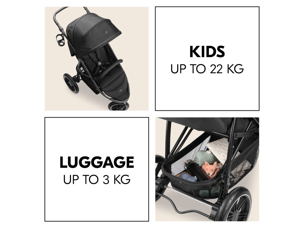 Kočík bez problémov unesie 22 kg plus ďalšie 3 kg v košíku.