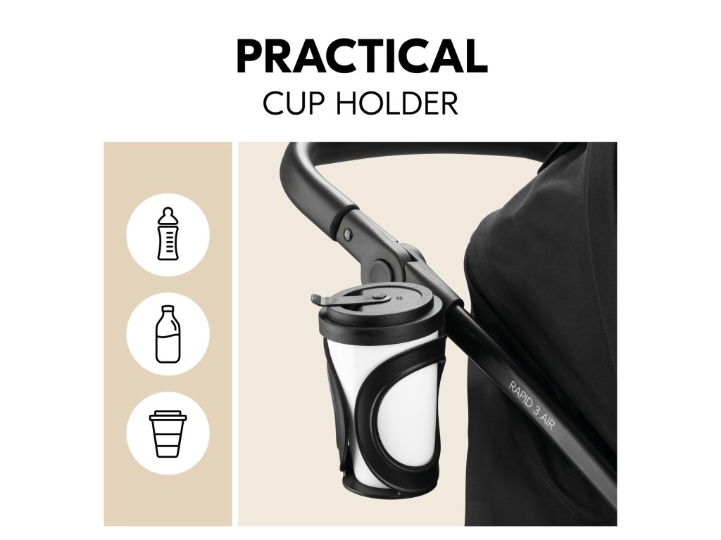 PRAKTICKÁ VÝBAVA // Kočík je vybavený praktickým držiakom na nápoje, či už na kávu alebo fľašu vášho dieťaťa, aby boli vaše prechádzky čo najpríjemnejšie.