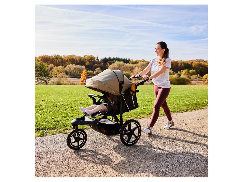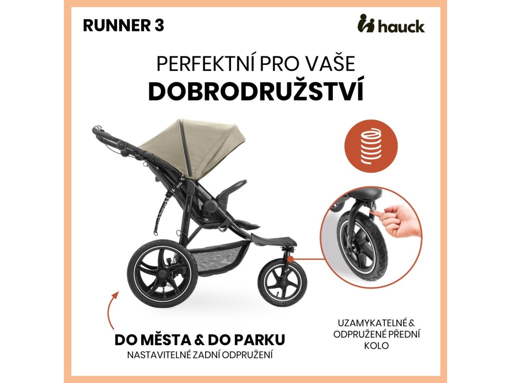 S NAFUKOVACÍMI KOLESAMI XL A ODBLOKOVATEĽNÝMI // 3x odpružené nafukovacie kolesá vhodné do každého terénu: robustný kočík RUNNER 3 s dvojitým nastaviteľným zadným odpružením a uzamykateľným predným kolesom vás zavezie takmer kamkoľvek. Ideálny pre vaše dobrodružstvá!