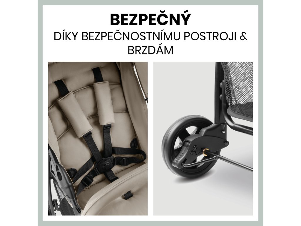 Přední madlo a 5bodový polstrovaný bezpečnostní pás zaručí bezpečnost Vašeho dítěte. Kočárek při zastavení spolehlivě zajistí parkovací brzda. Tento model lze kompaktně složit a uložit i do toho nejmenšího kufru automobilu.