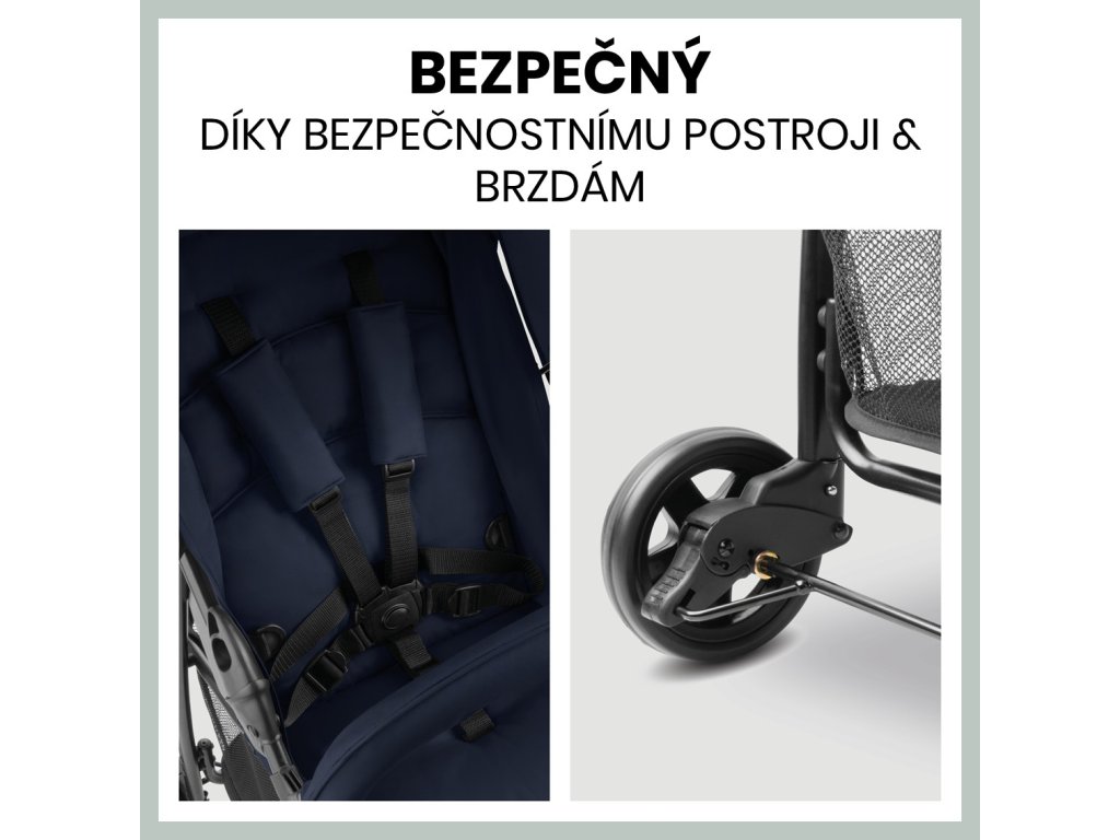 Přední madlo a 5bodový polstrovaný bezpečnostní pás zaručí bezpečnost Vašeho dítěte. Kočárek při zastavení spolehlivě zajistí parkovací brzda. Tento model lze kompaktně složit a uložit i do toho nejmenšího kufru automobilu.