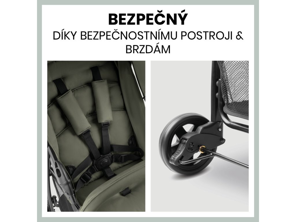 Přední madlo a 5bodový polstrovaný bezpečnostní pás zaručí bezpečnost Vašeho dítěte. Kočárek při zastavení spolehlivě zajistí parkovací brzda. Tento model lze kompaktně složit a uložit i do toho nejmenšího kufru automobilu.