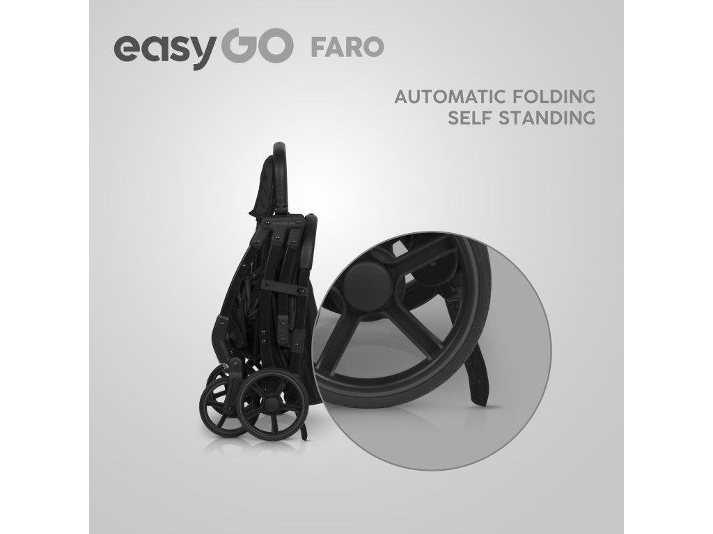 - Automatický systém skladania: Kočík Faro je vybavený automatickým systémom skladania, ktorý umožňuje jednoduché zloženie jednou rukou. Po zložení zostáva kočík vo vertikálnej polohe a ochranná bariéra slúži ako pohodlná rukoväť na prenášanie.