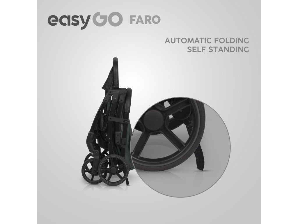- Automatický systém skladania: Kočík Faro je vybavený automatickým systémom skladania, ktorý umožňuje jednoduché zloženie jednou rukou. Po zložení zostáva kočík vo vertikálnej polohe a ochranná bariéra slúži ako pohodlná rukoväť na prenášanie.