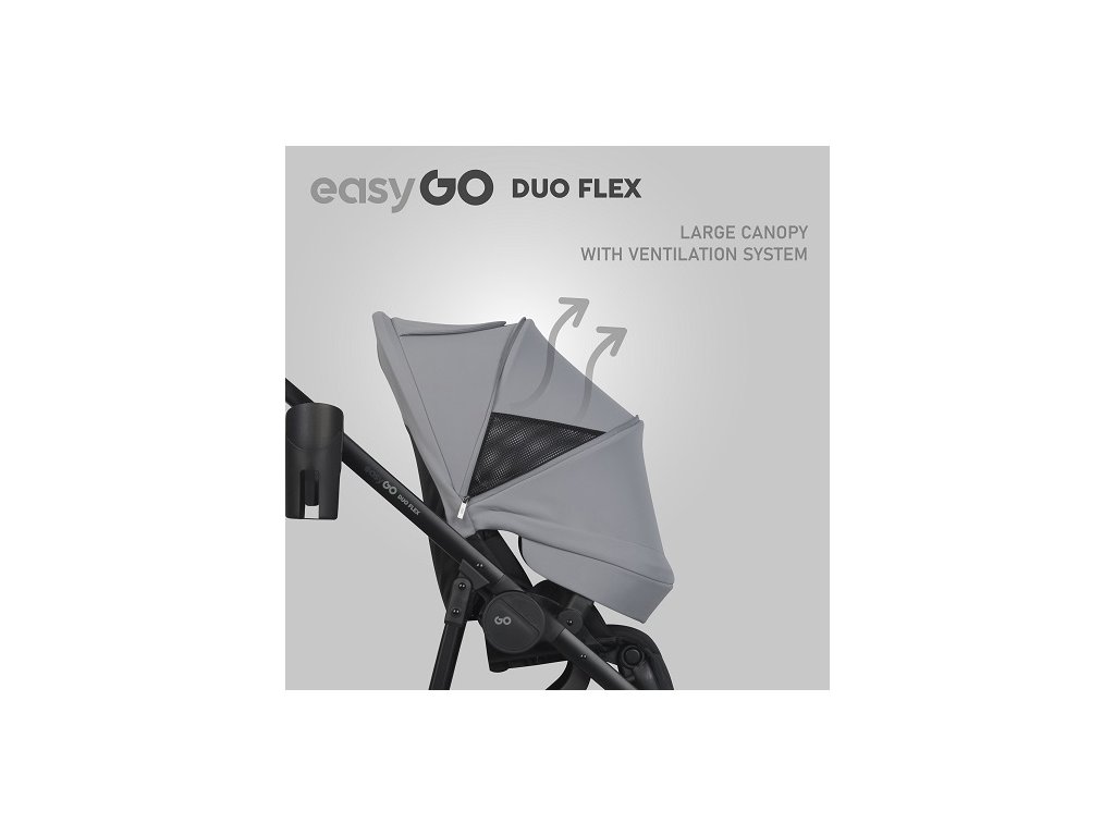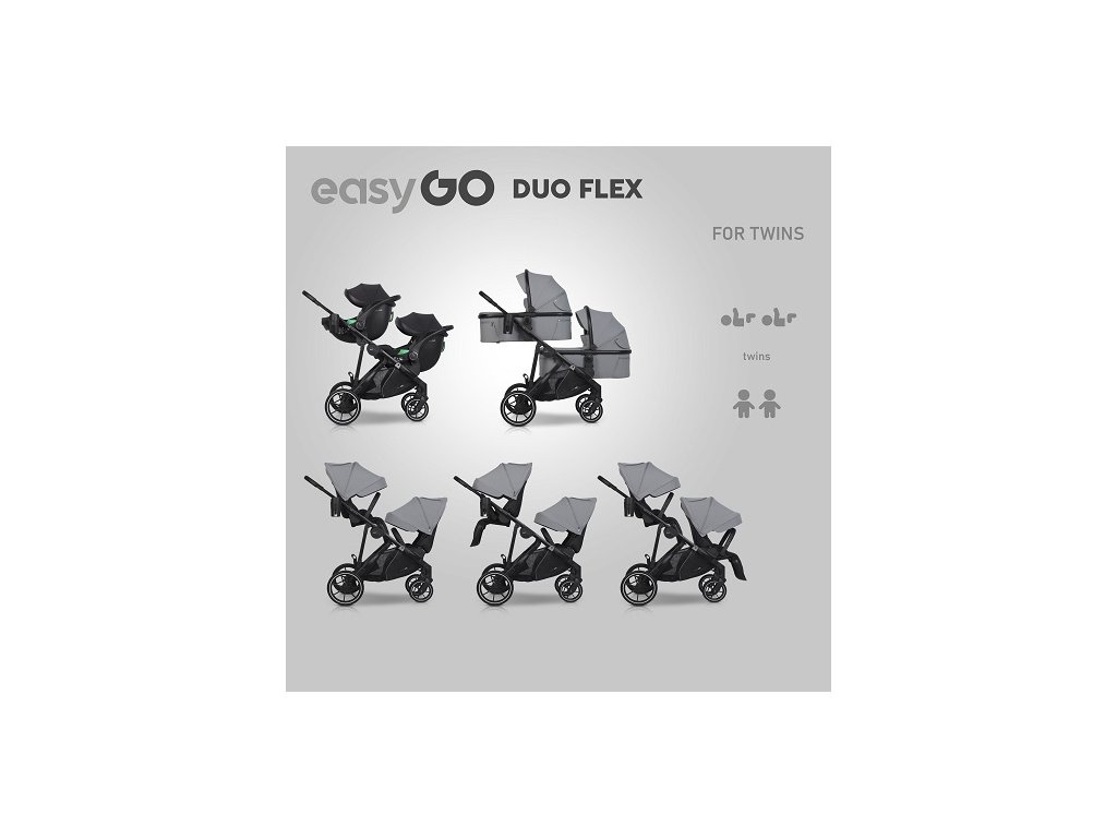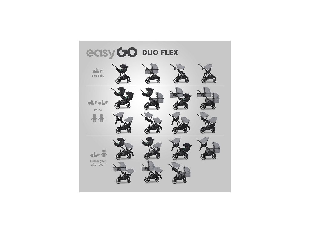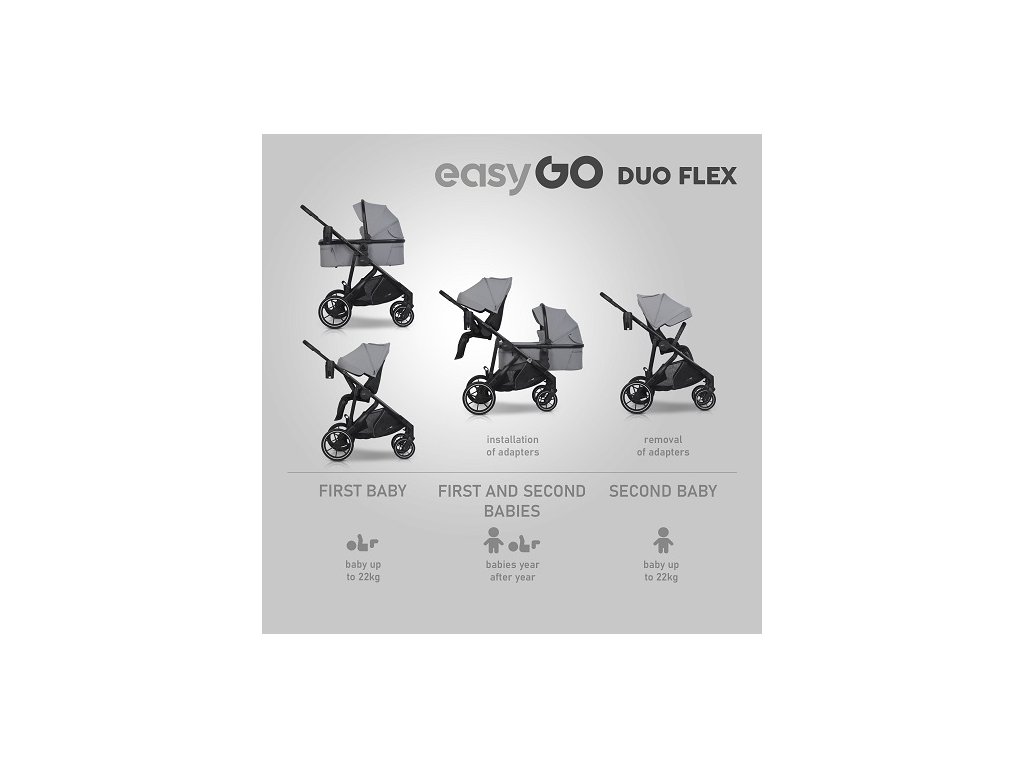 EasyGo DUOFLEX predstavuje revolučné riešenie pre moderné rodiny. Tento multifunkčný kočík môžete používať ako klasický kočík pre jedno dieťa (v športovej verzii alebo ako 2v1 s jednou hlbokou vaničkou a jedným športovým sedadlom), a keď sa rodina rozrastie o druhé dieťa, jednoducho ho premeníte na kočík pre dve deti bez nutnosti dokupovať akékoľvek dodatočné komponenty.