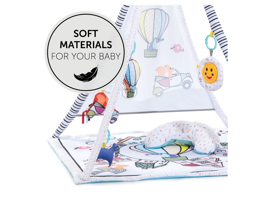 MNOŽSTVO STIMULUJÚCICH HRAČIEK // Hrací stan s hrazdičkou umožňuje pripevnenie 5 rôznych veselých závesných hračiek tak, aby ich malo dieťatko na dosah. Vďaka týmto roztomilým závesným hračkám môže dieťatko počúvať zvuky, objavovať svoj vlastný odraz alebo počúvať hudbu.