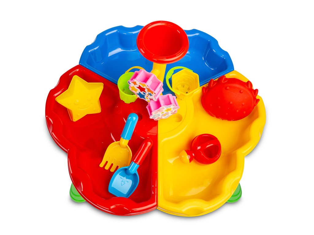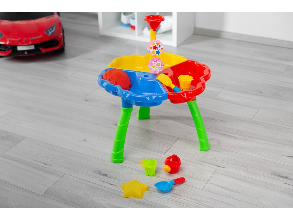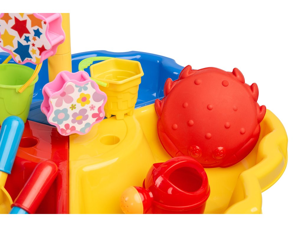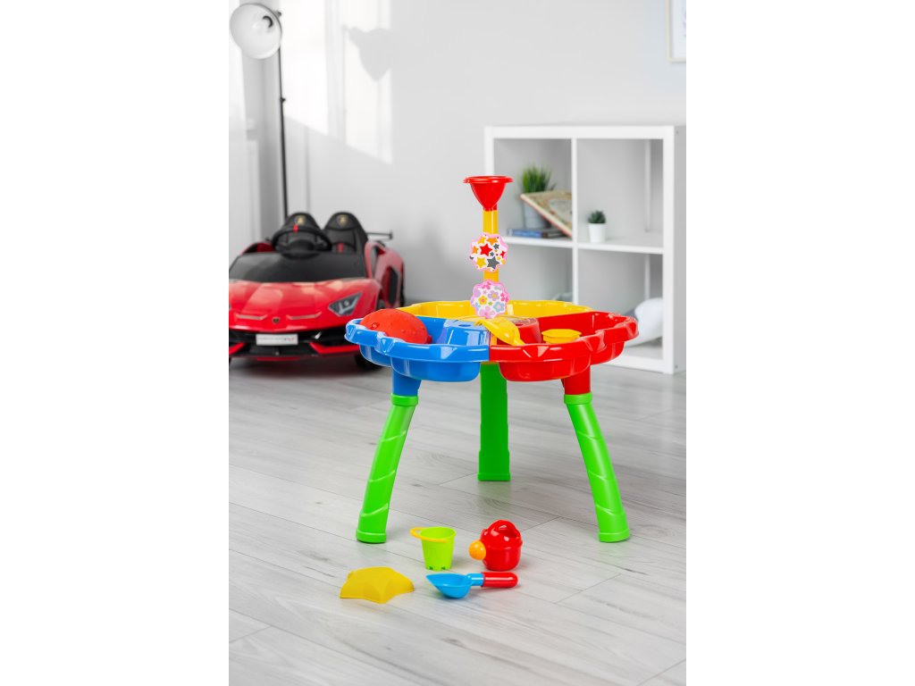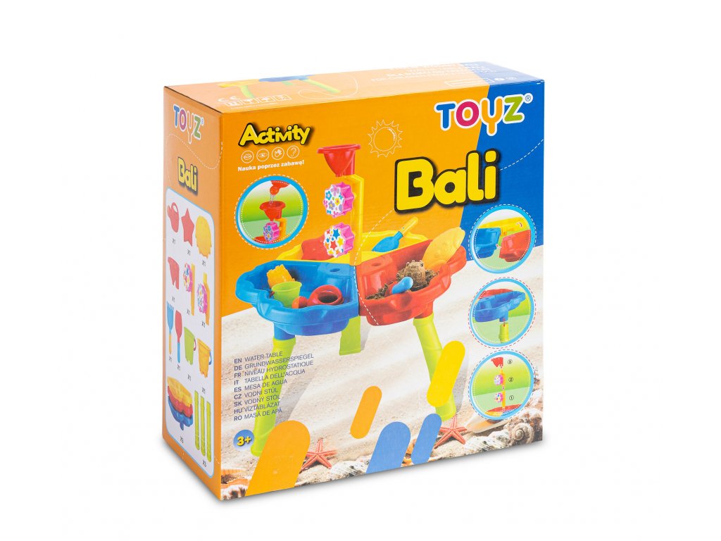 Bali je vzdelávací stôl zo série Toyz Activity, ideálny na hranie doma, na balkóne alebo na záhrade. Deti môžu rozvíjať svoju zvedavosť o svete a hrať sa s vodou alebo pieskom. Bohatá sada doplnkov umožňuje Bali zabaviť deti na dlhé chvíle. Sada obsahuje: 2 veľké formy (krab a hviezda), lopatku a hrable, 2 vedrá, kanvicu na vodu a vežu s navijakmi. Po skončení zábavy je možné stôl ľahko zložiť a schovať do obalu.
