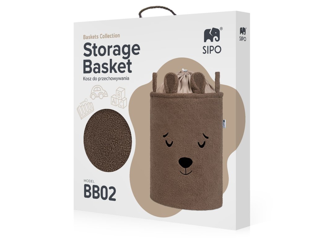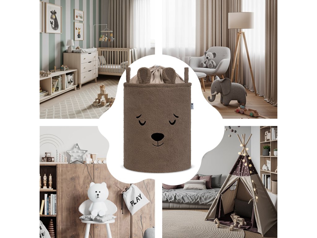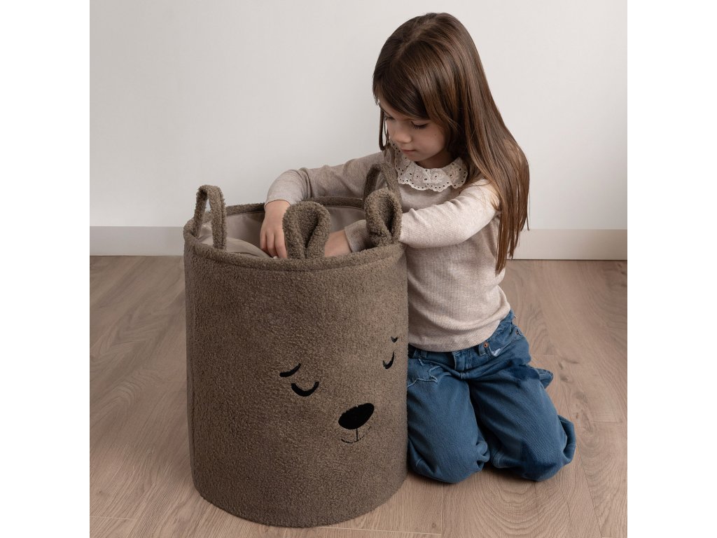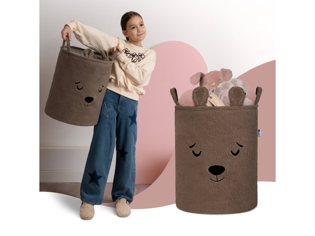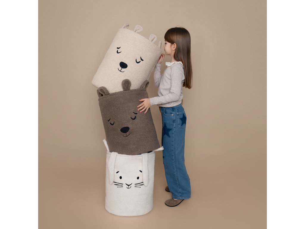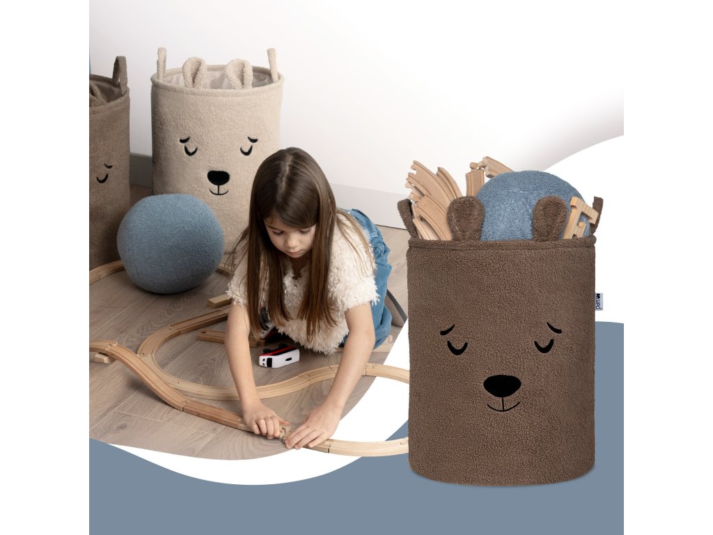 S objemom 43 litrov je kôš ideálny na použitie v detskej izbe, obývacej izbe, spálni alebo kúpeľni – poskytuje pohodlný úložný priestor na hračky, textil a doplnky bez toho, aby zaberal príliš veľa miesta. Vonkajšia vrstva je vyrobená z mäkkého, nadýchaného bouclé materiálu, ktorý prirodzene podnecuje dotyk a interakciu. Priateľské motívy zvieratiek – ako napríklad roztomilý medvedík – pomáhajú vytvoriť emocionálne spojenie s produktom a premeniť upratovanie na zábavnú činnosť namiesto povinnosti.