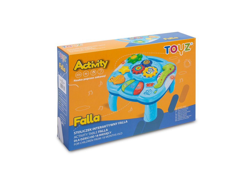 Interaktívny stôl Falla Toyz, ktorý poskytne veľa zábavy pre najmenších. Doska stola je vybavená mini klavírom s klávesmi DO RE MI, 3 tlačidlami (každé funguje inak), ktoré zapínajú rôzne melódie a gombíkom s prevodmi. Živé farby pútajú pozornosť a nabádajú k zábave. Stôl má 2-stupňové ovládanie hlasitosti. Falla umožňuje odpojiť nohy a vďaka špeciálnym popruhom ho pripevniť k postieľke alebo na mašli v kočíku.