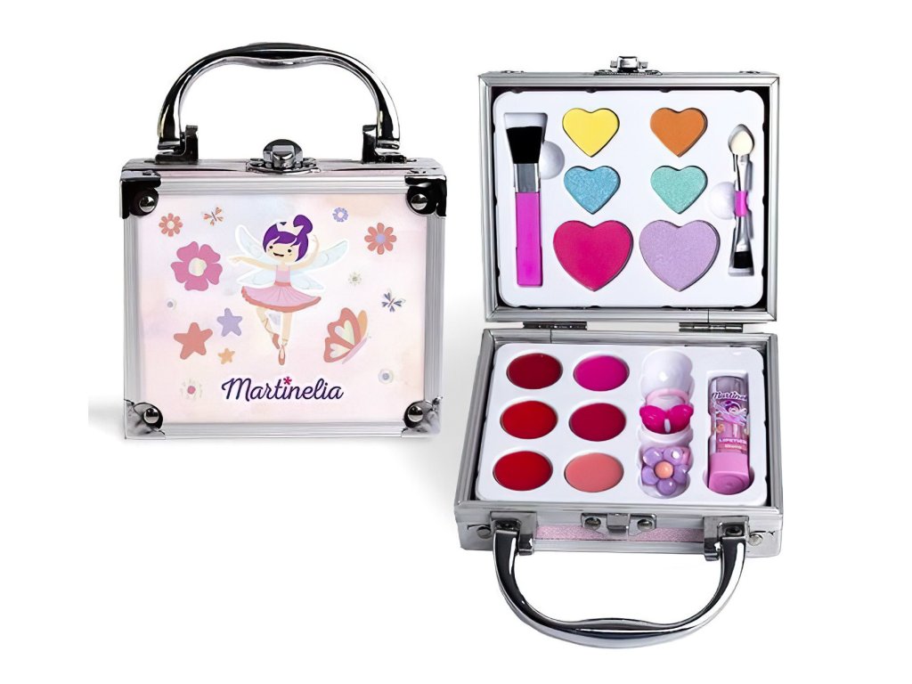 Vo vnútri kufríka nájdete bohatú kozmetickú sadu, ktorá obsahuje rôzne farby leskov na pery, očných tieňov a detských líceniek. Farby sú starostlivo vybrané tak, aby boli vhodné pre citlivú detskú pleť, s jemnými odtieňmi ružovej, fialovej a ďalších pastelových tónov. Súčasťou kufríka sú aj dva rozkošné prstienky, ktoré dodávajú celému setu ďalší hravý rozmer. Deti si tak môžu vyskúšať nielen líčenie, ale aj ozdobiť svoje ruky krásnymi prstienkami a cítiť sa ako skutočné módne ikony.