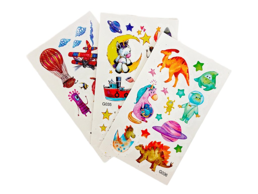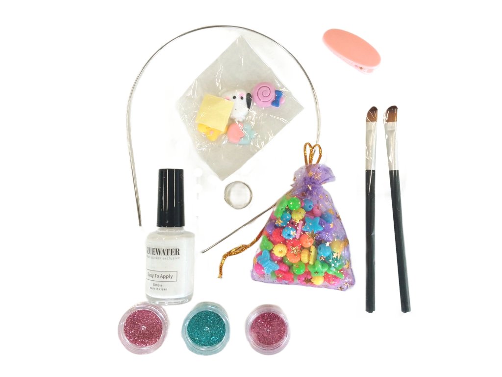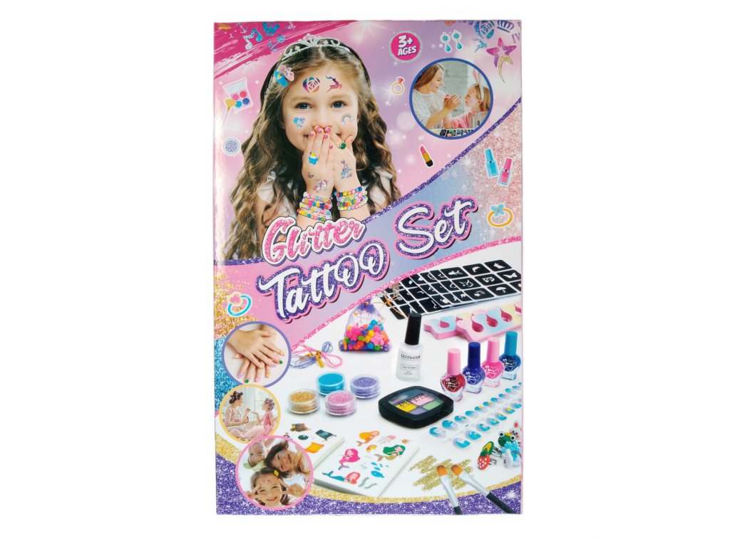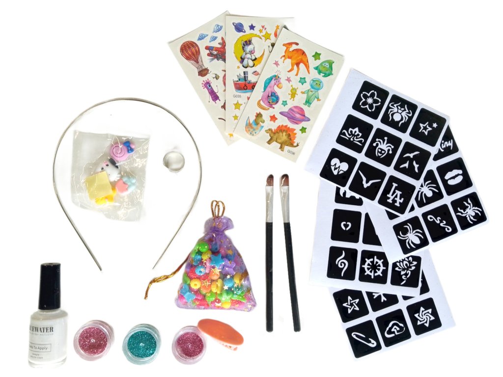 Súčasťou sady sú trblietavé glitre v rôznych farbách, štetce, lepidlo na tetovanie, šablóny s rôznymi motívmi a farebné nálepky. Ďalej tu nájdete ozdobné korálky, elastické vlákno a prívesky na tvorbu jednoduchých náramkov alebo náhrdelníkov. Nechýbajú ani samolepiace tetovačky s motívmi zvieratiek a dinosaurov.