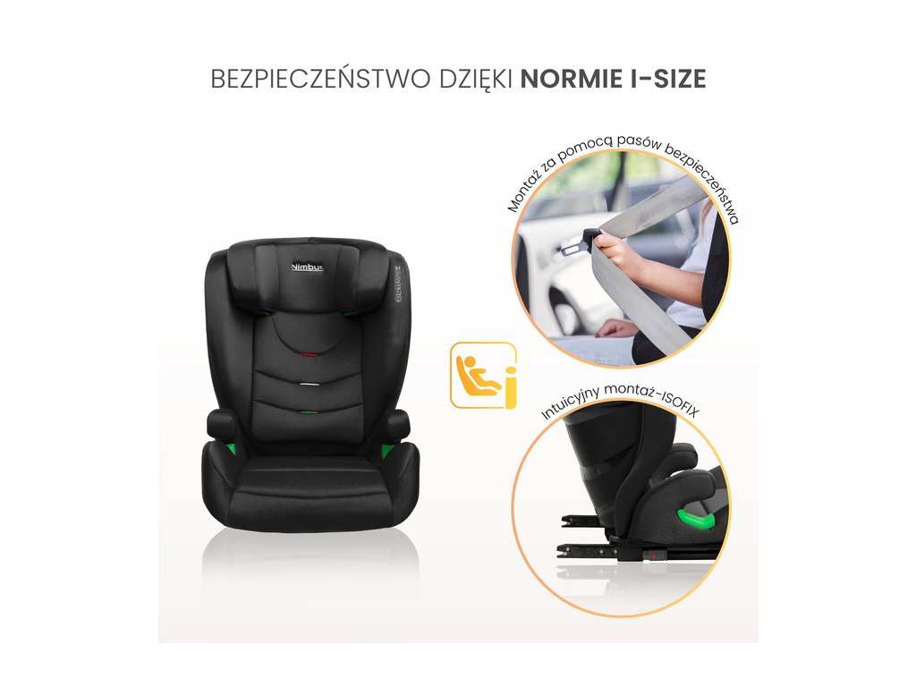 Model Nimbus spĺňa požiadavky prísnej normy R129/i-Size, čo zaisťuje najvyššiu úroveň bezpečnosti pre vaše dieťa. Sedačku je možné optimálne prispôsobiť rôznym vozidlám pomocou inštalácie cez systém ISOFIX, bezpečnostných pásov auta a polohovateľného operadla, čo zaručuje stabilné a bezpečné upevnenie počas jazdy.