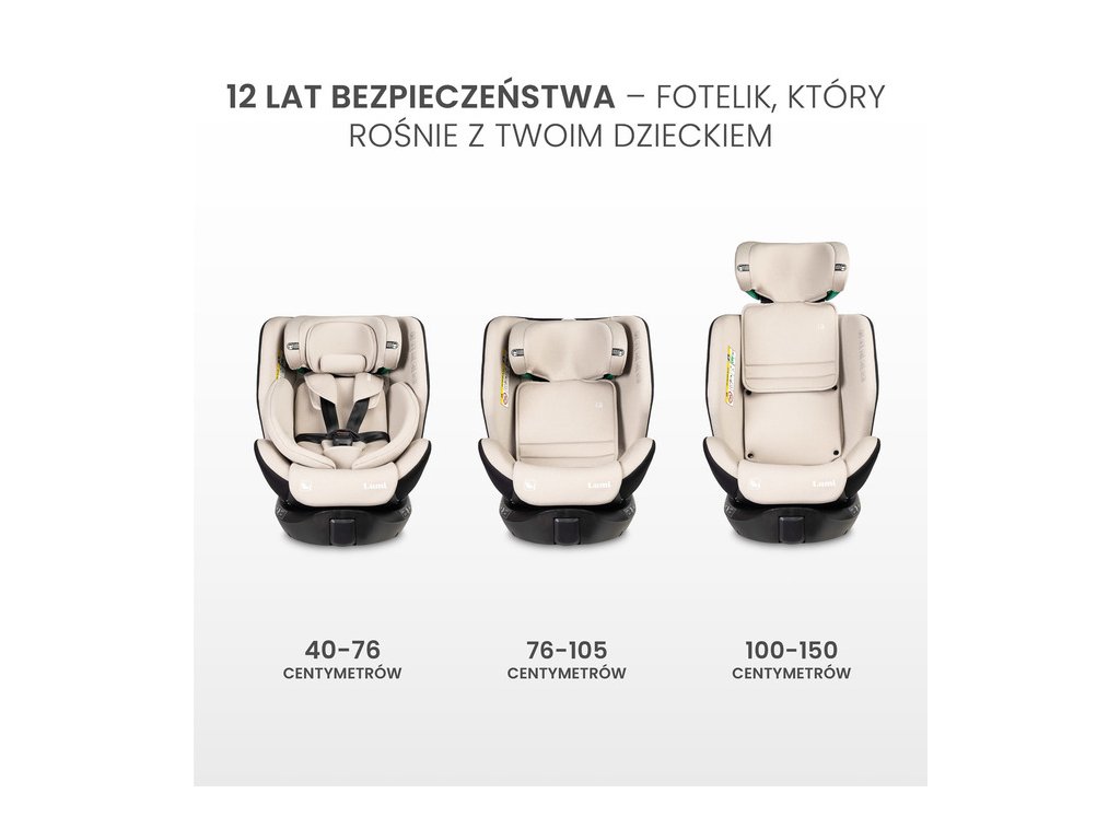 Lumi je ideálna autosedačka pre náročných rodičov, ktorí si cenia najvyššie bezpečnostné štandardy aj estetiku. Tento všestranný model rastie s vaším dieťaťom a ponúka pohodlie a ochranu v každej fáze jeho rastu – od výšky 40 cm do 150 cm.