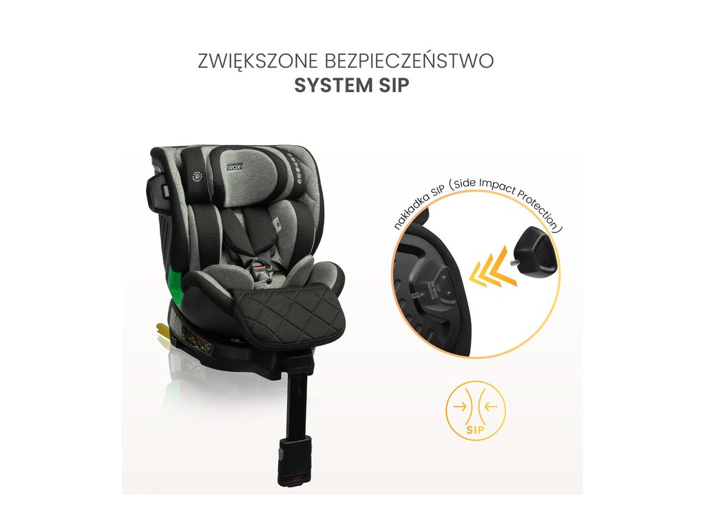 Bezpečnostný prvok SIP (Side Impact Protection): Zabezpečuje zvýšenú ochranu pred bočnými nárazmi vďaka špeciálnemu prekrytiu, ktoré je možné nastaviť podľa polohy dieťaťa v aute.