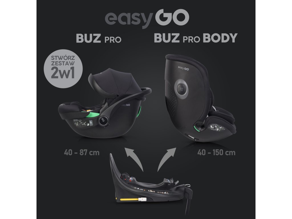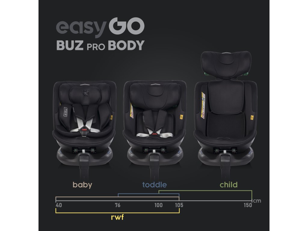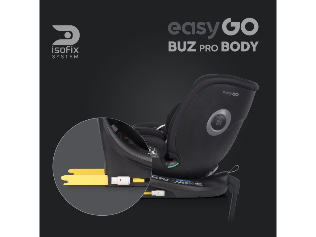 - Set 2 v 1: Buz Pro Body je navrhnutý ako doplnok k autosedačke EasyGo Buz Pro, čo umožňuje využitie jednej otočnej základne ISOFIX pre obe sedačky.