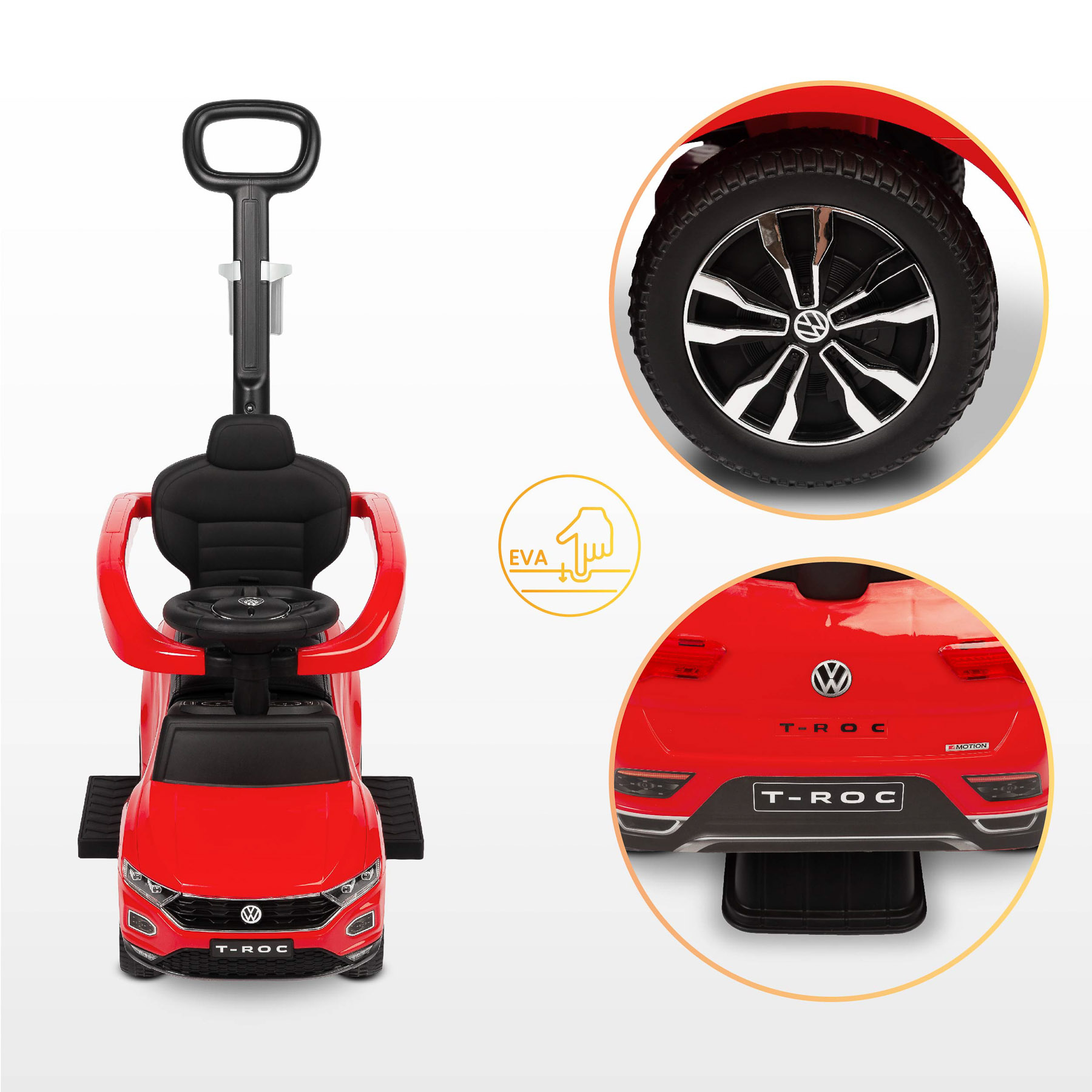 Vďaka tichým a odolným kolieskam z peny EVA bude model skvele fungovať na podlahe doma aj vonku. Ergonomické sedadlo potiahnuté mäkkou ekokožou zaisťuje pohodlie a jednoduché udržiavanie čistoty. Zadná noha slúži ako stabilizátor, zabraňuje prevráteniu kočíka a zaisťuje bezpečnosť počas hry.