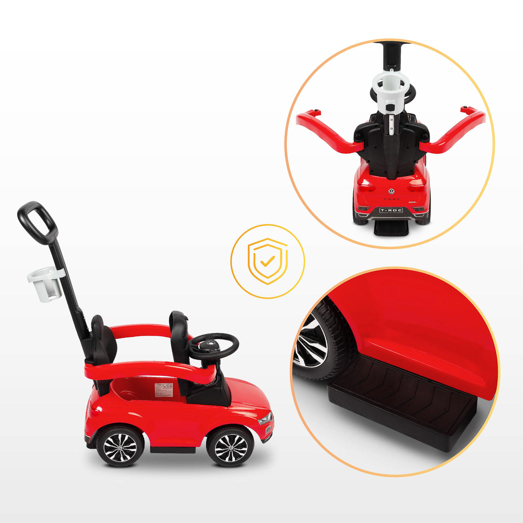 - Dlhá, odnímateľná rukoväť na tlačenie vozidla s držiakom na fľašu