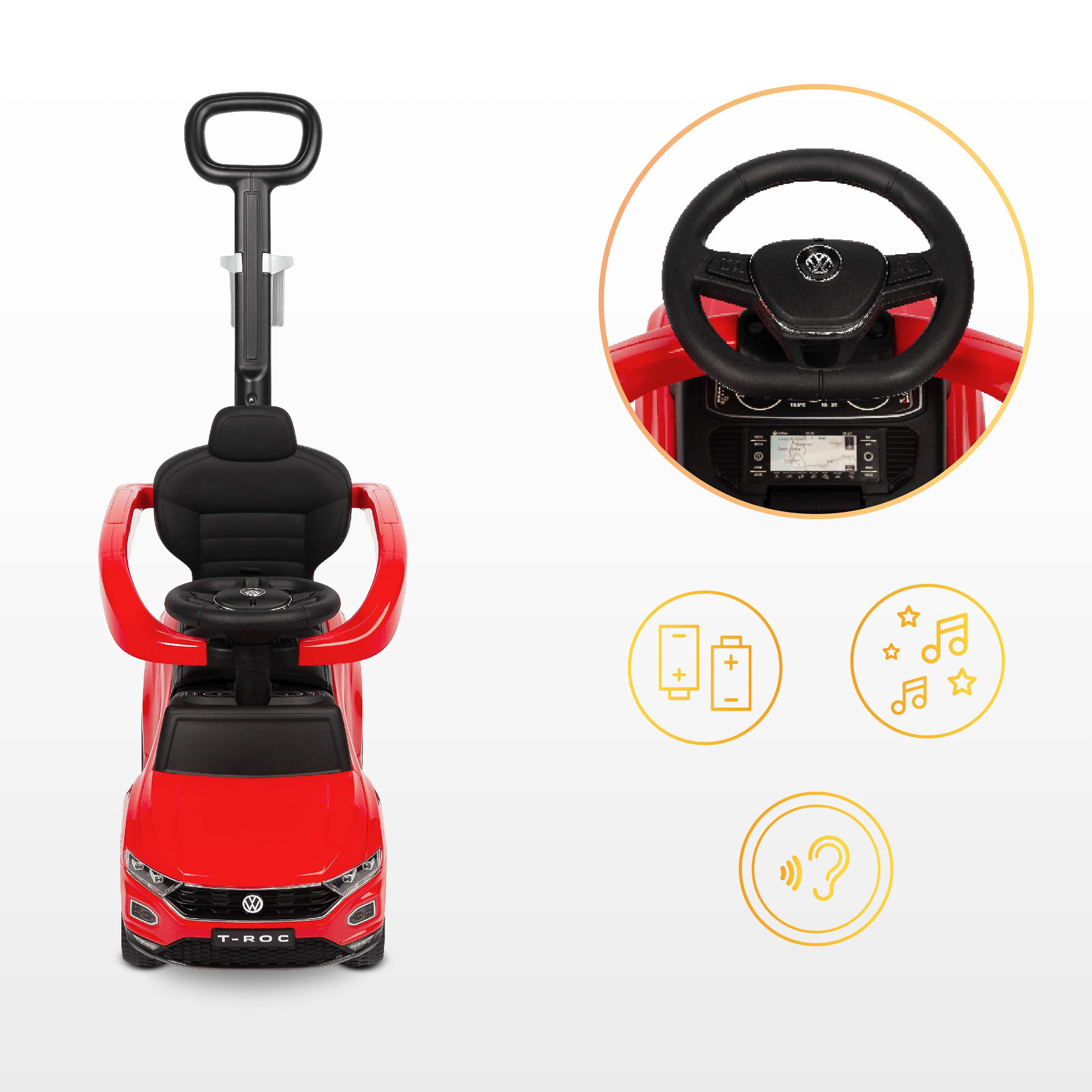 Má zvukový panel a imitácie figúrok, ktoré rozvíjajú sluch a podporujú interaktívnu hru, čím stimulujú detskú fantáziu. Dlhá odnímateľná rukoväť s držiakom na fľašu umožňuje rodičom jednoduché vedenie a ovládanie jazdy. Zvukový panel vyžaduje 2 x AA 1,5V batérie (nie sú súčasťou balenia).