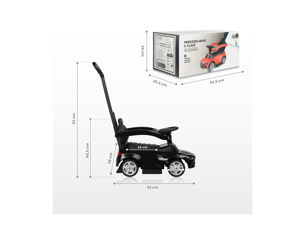 Odrážadlo Mercedes triedy C od Toyz je vozidlo, ktoré rastie s dieťaťom. Môže slúžiť ako odrážadlo, chodítko aj odrážadlo. Vďaka licencii značky Mercedes bol verne reprodukovaný jedinečný štýl modelu a jeho kvalita spracovania. Odrážadlo je ideálne na spoločné prechádzky. Dieťa sa môže pohybovať samostatne a keď je unavené, rodič ľahko prevezme kontrolu nad vozidlom. Výsuvné plošiny umožňujú bezpečnú oporu nôh a zábradlie chráni pred vypadnutím . Ďalšou atrakciou je volant s melódiami a klaksónom. Rodičia ocenia úložný priestor na hračky pod sedadlom. Technické údaje: Vekové rozpätie: 12-36 mesiacov Hmotnosť: 3,7 kg Rozmery: 83x40x92 cm (s rukoväťou)