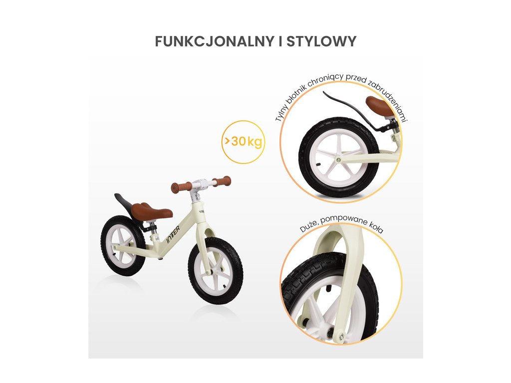 Bicykel má veľké, mäkké kolesá, ktoré účinne tlmia nárazy a zaisťujú plynulu jazdu aj v nerovnom teréne. Protišmykové rukoväte poskytujú bezpečný úchop počas jazdy a zvyšujú bezpečnosť dieťaťa. Veľké a pohodlné sedadlo z ekokože zaistí pohodlie počas jazdy.