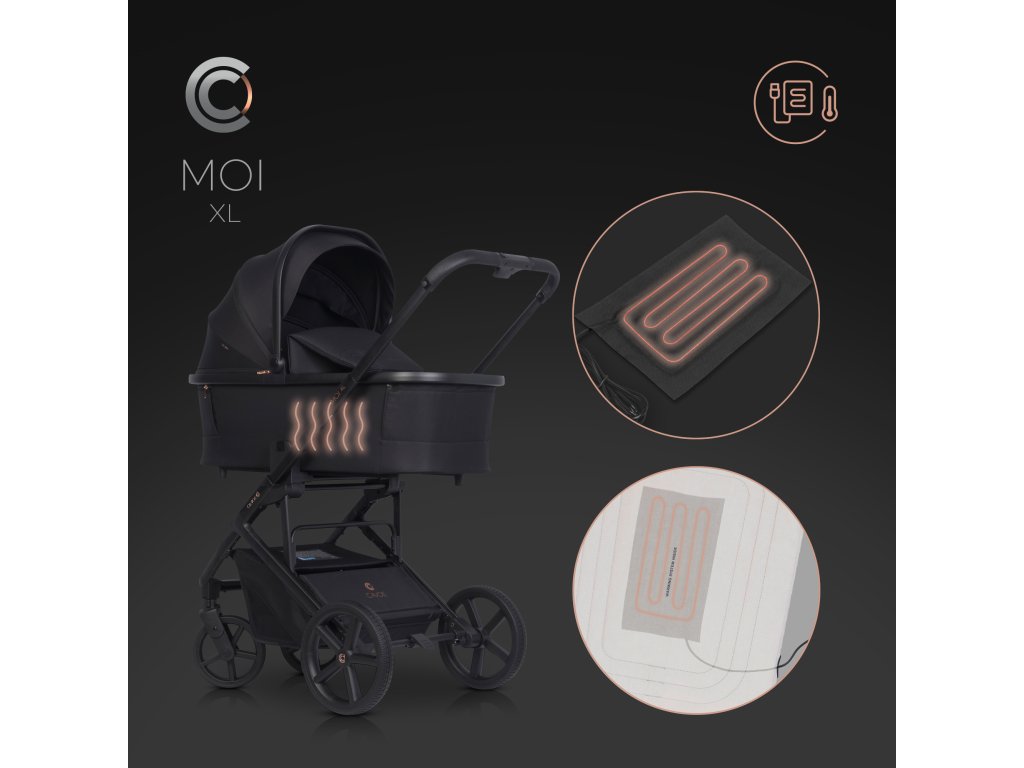 - Systém ohrevu: Kočík je vybavený kapsami na montáž ohrievacích panelov napájaných cez USB, čo je ideálne pre chladné mesiace.