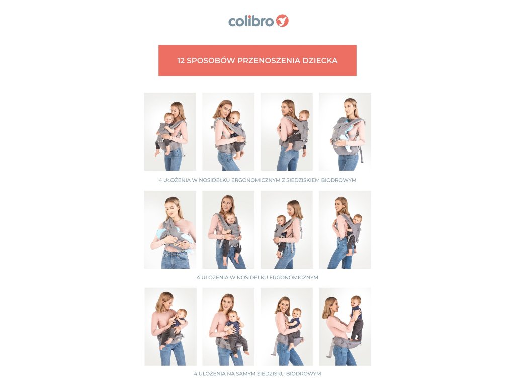 12 v 1 funkčnosť: Nosič Colibro Honey umožňuje až 12 rôznych spôsobov nosenia dieťaťa. Rodičia môžu vyberať z rôznych konfigurácií v závislosti od veku a váhy dieťaťa: