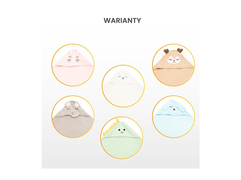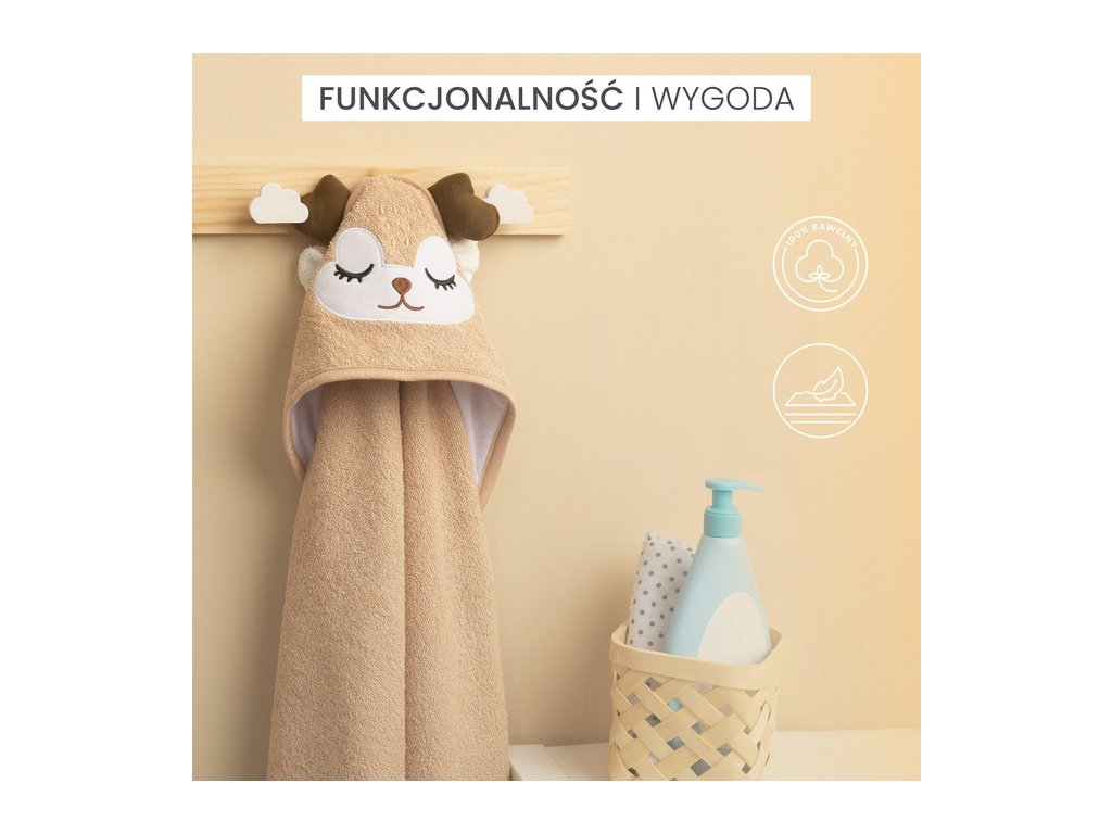 Kapucňa chráni hlavičku dieťaťa pred chladom a uľahčuje rýchle sušenie vláskov dieťaťa. Aplikácie v tvare roztomilých zvieratiek pútajú pozornosť dieťaťa a z kúpania urobia pekný doplnok každého dňa.