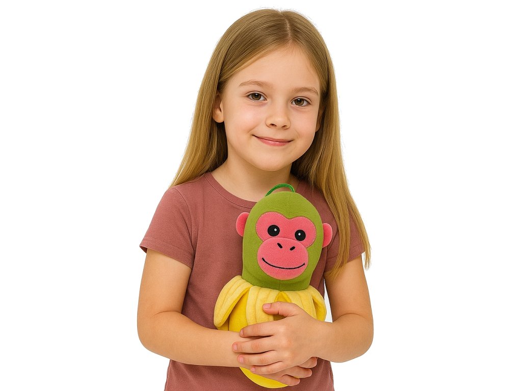 Táto roztomilá kombinácia opičky a banánu zaujme na prvý pohľad svojím farebným vzhľadom a pohodovým výrazom. Vyrobená je z hebkého, mäkkého plyšu, ktorý je veľmi príjemný na dotyk. Výplň je ľahká, takže si ju ľahko obľúbia aj najmenšie deti. Vďaka veľkosti 25 cm sa skvele hodí do detských rúk, školských tašiek alebo ako dekorácia na pracovný stôl.