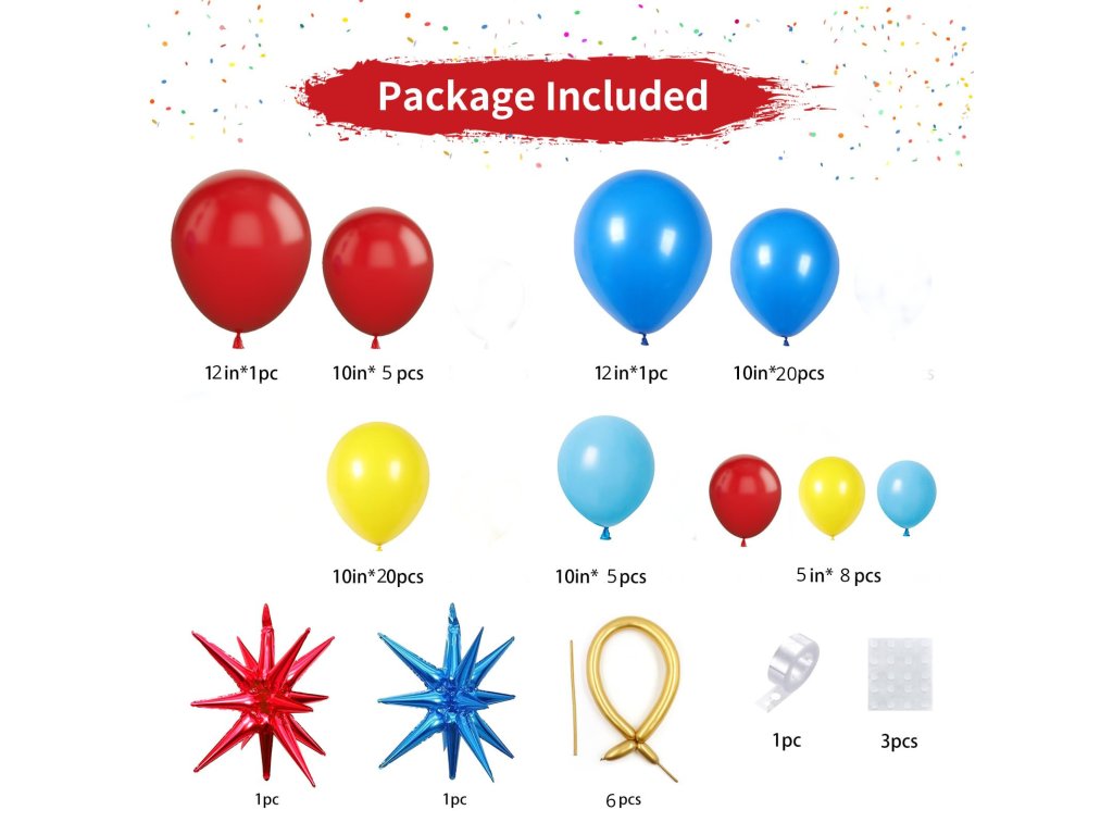 Veľká sada balónov na girlandu Chain Star je perfektnou voľbou pre vytvorenie nezabudnuteľnej atmosféry na oslave. Obsahuje celkovo 70 ks balónov v jasných cirkusových farbách – červená, modrá a žltá – a ďalšie doplnky, ktoré povýšia dekoráciu na profesionálnu úroveň. V sade nájdete balóny v rôznych veľkostiach (od 5" až po 12") a špeciálne prvky, ako sú hviezdy v 3D prevedení a zlaté reťazové balóny, ktoré dodávajú nádych elegancie a originality.