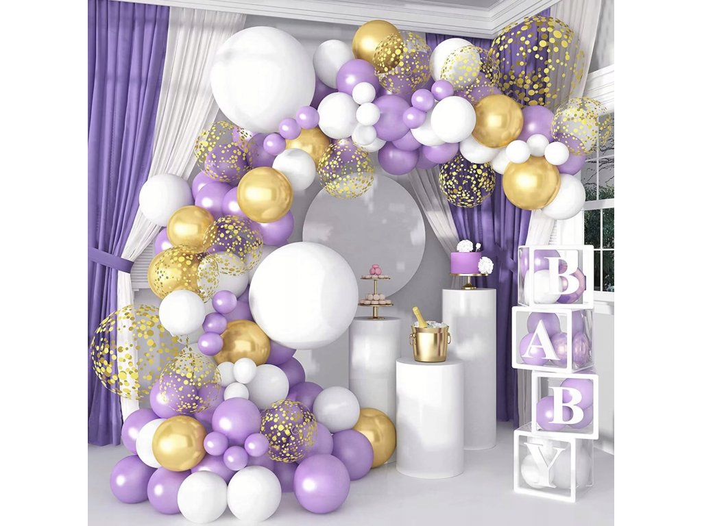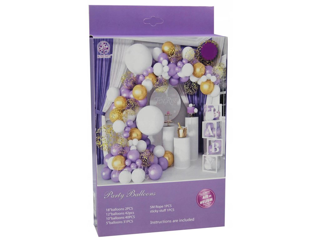 Táto moderná párty balónová girlanda vo fialovo-zlatých farbách, vytvorí originálnu dekoráciu. Poslúži výborne ako výzdoba pre detské narodeniny, oslavy, výročia, na príležitosť narodenia dieťatka a mnohým iným udalostiam.